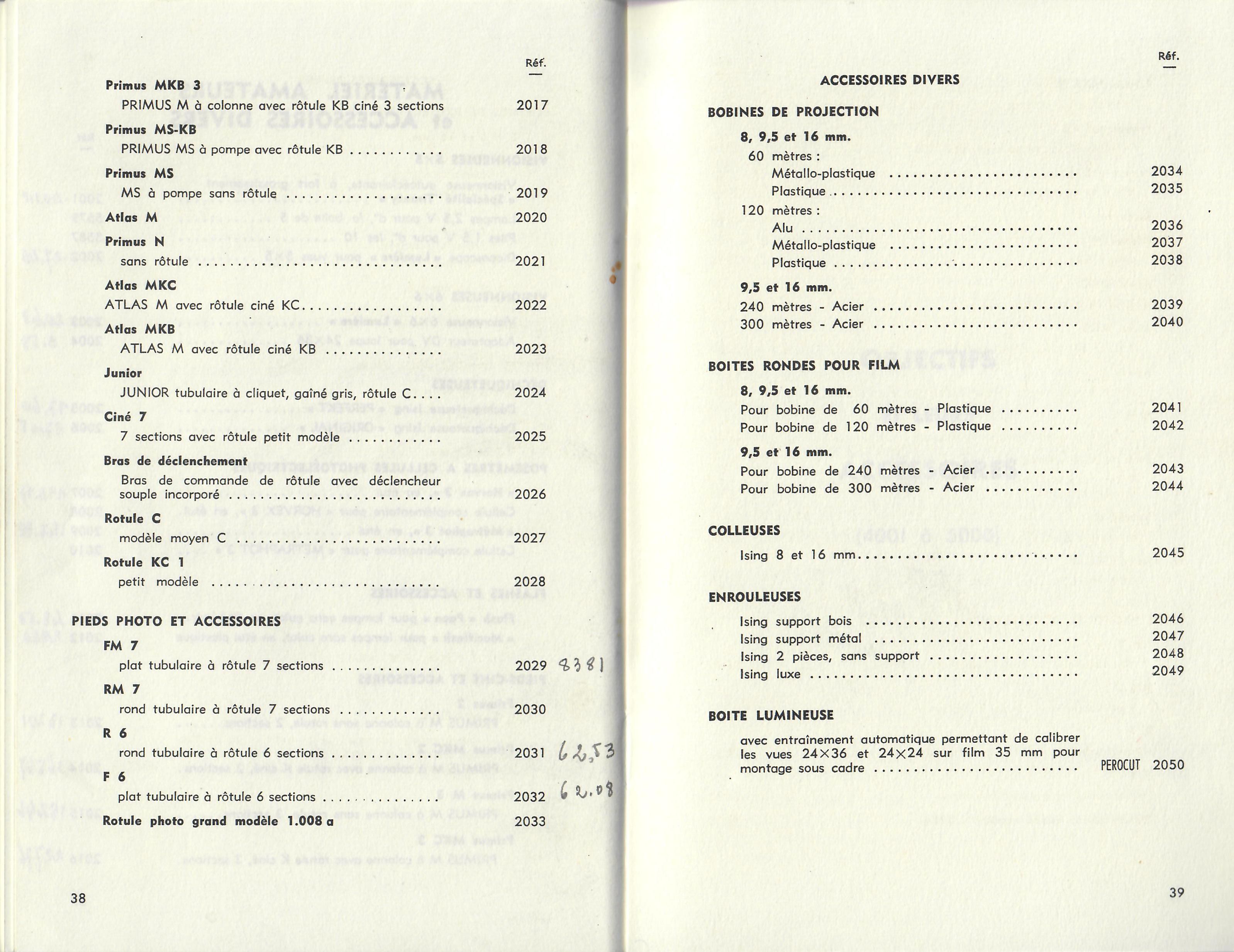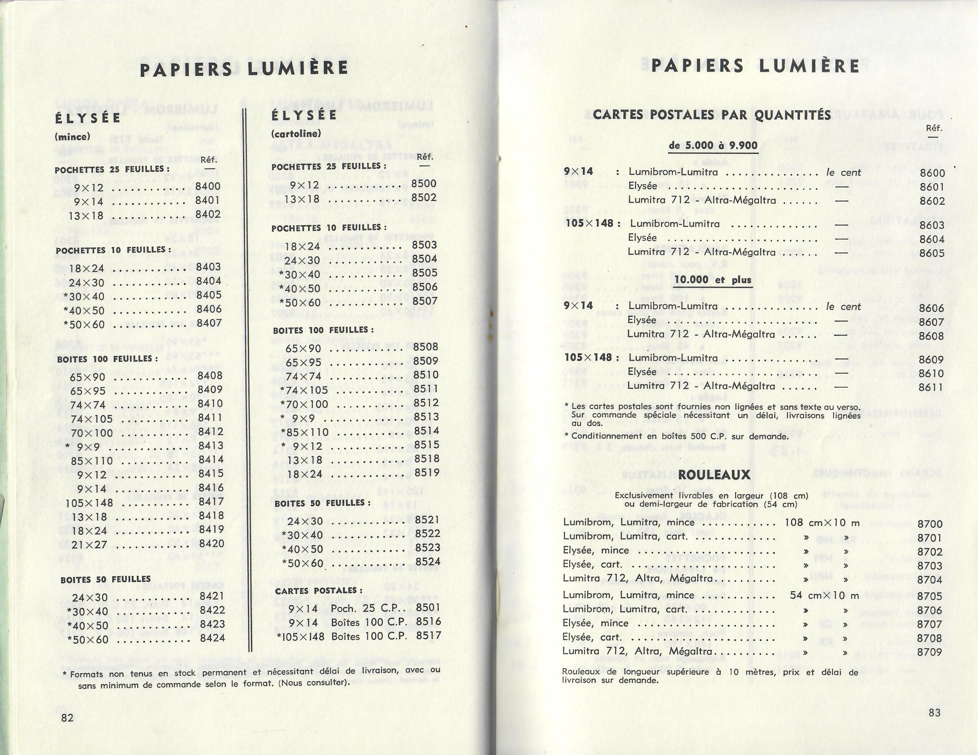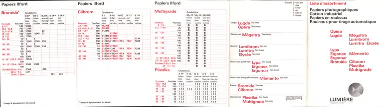 Liste d'assortiment Papiers photographiques, Carton industriel, Papiers en rouleaux, Rouleaux pour tirage automatique - 1967