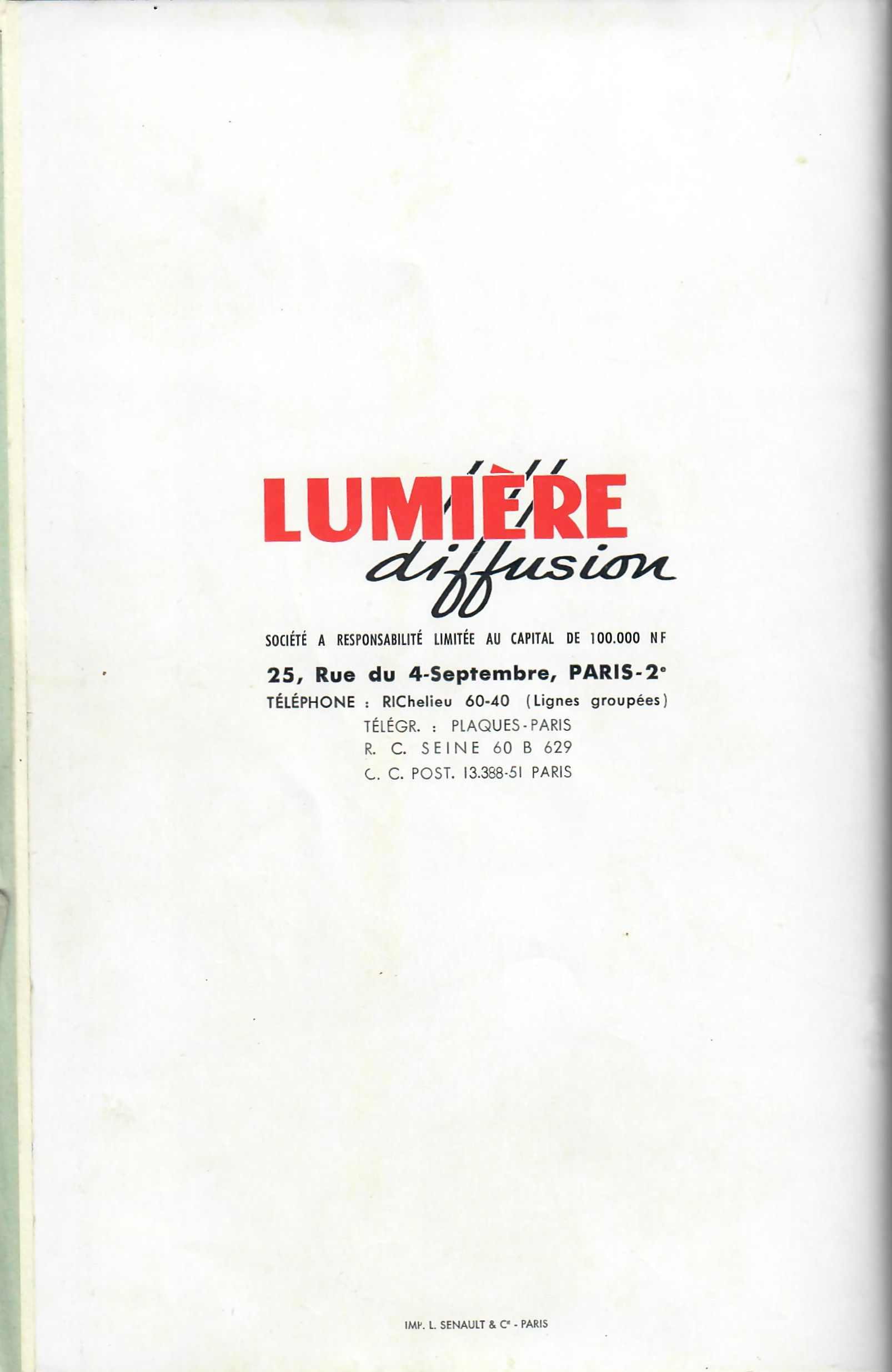 Lumière Diffusion a été créée avec un capital de 100.000 nouveaux francs et sa dissolution a été prononcée le 1er mai 1961.