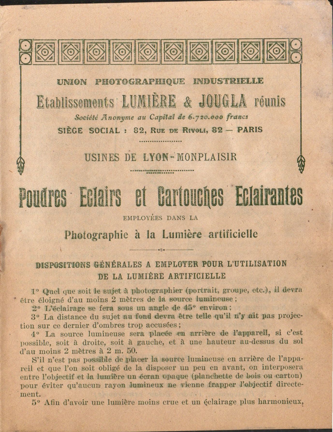 L'Union Photographique Industrielle - Établissements Lumière & Jougla réunis a été créée le 10 mars 1911. Son siège social est 82 rue de Rivoli à Paris.