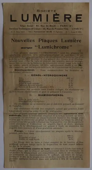 Le premier brevet relatif à la plaque Autochrome est déposé en 1903. Ce n'est qu'en 1907 qu'elle sera commercialisée, couronnant 7 années de recherche. Le prix de la boîte de 4 plaques est identique à celui d'une boîte de 12 plaques noir et blanc...