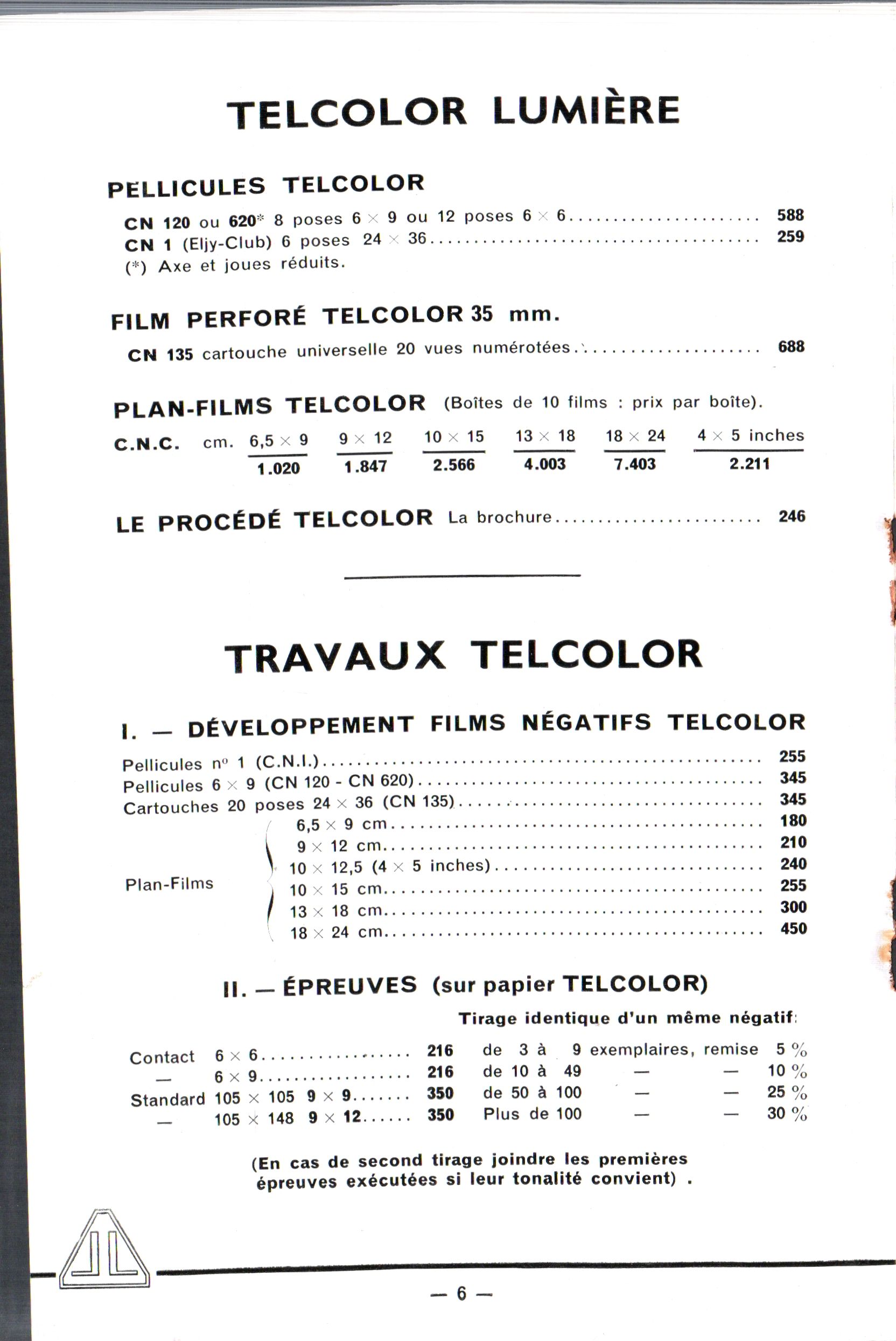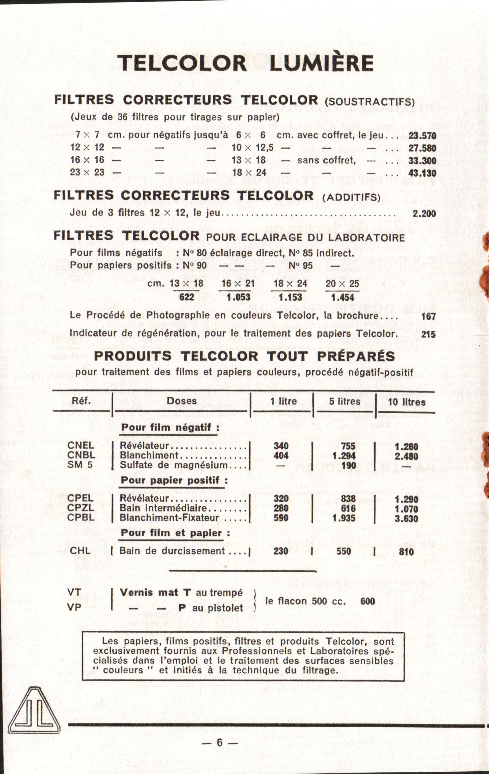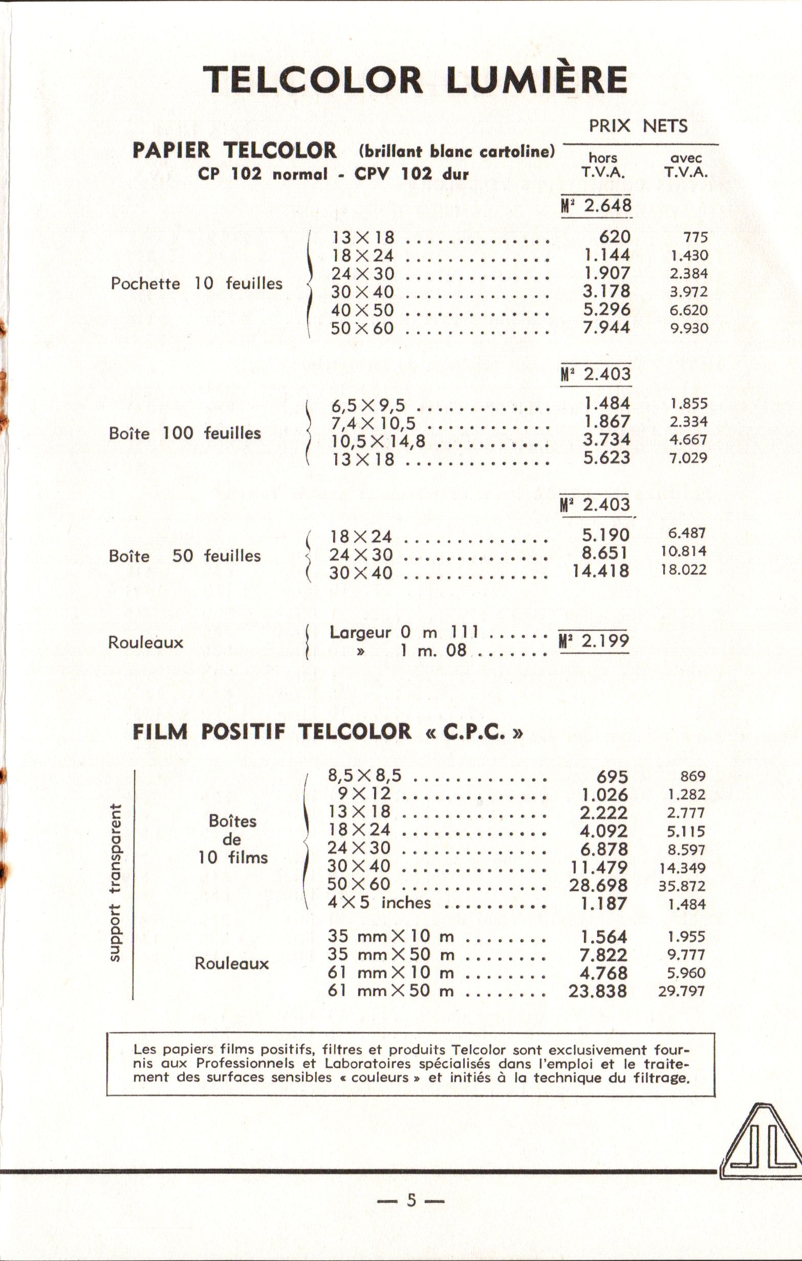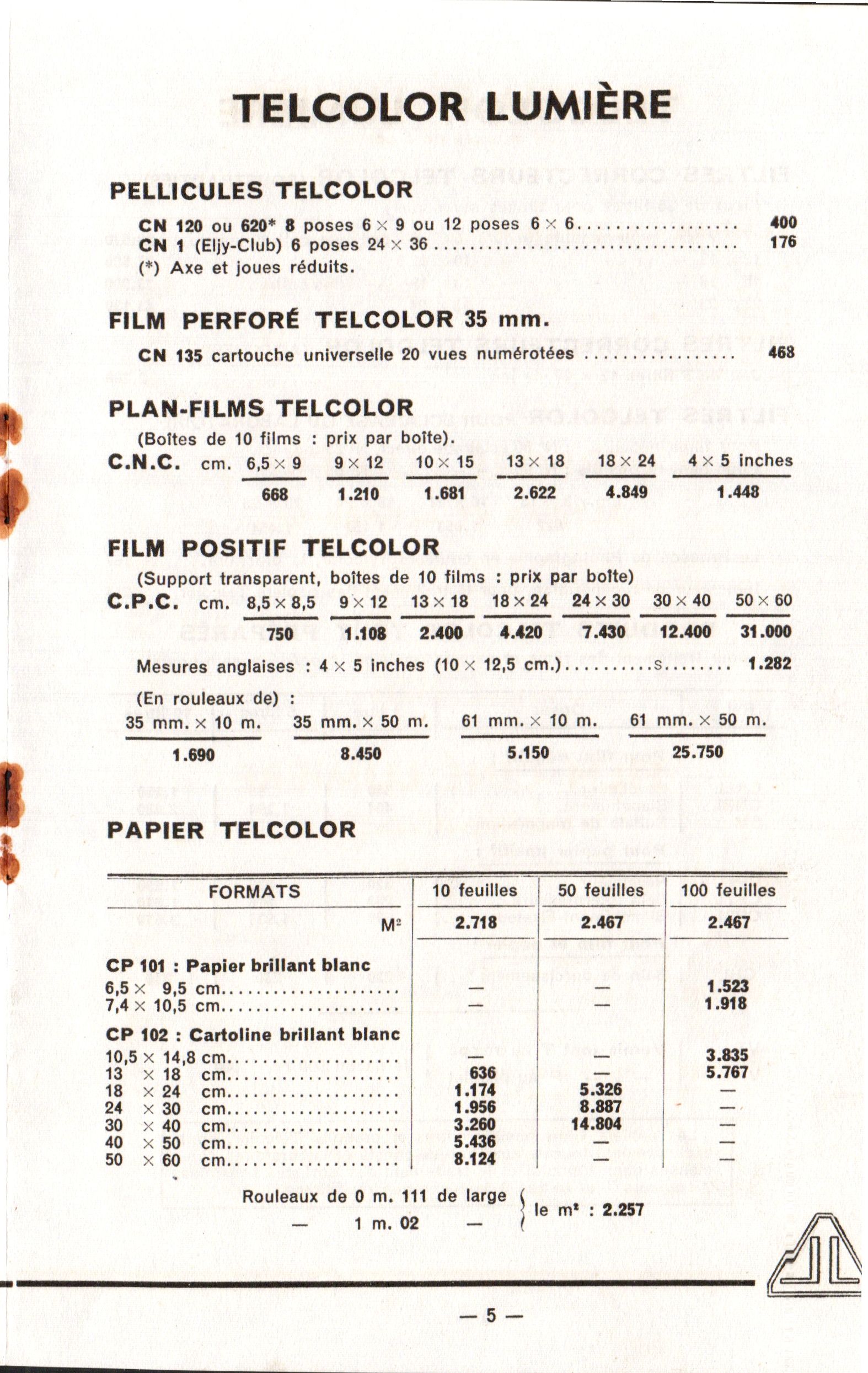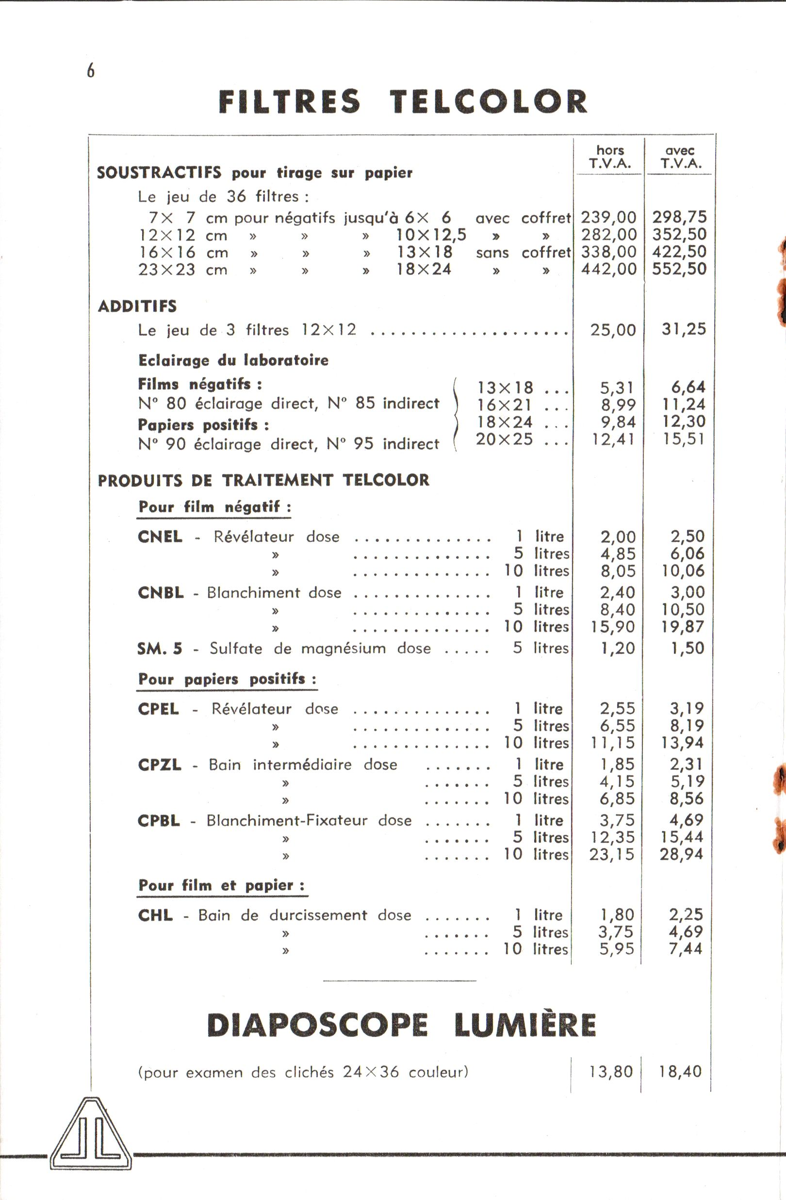 Tarif Films Papiers Filtres Produits Telcolor - mai 1955