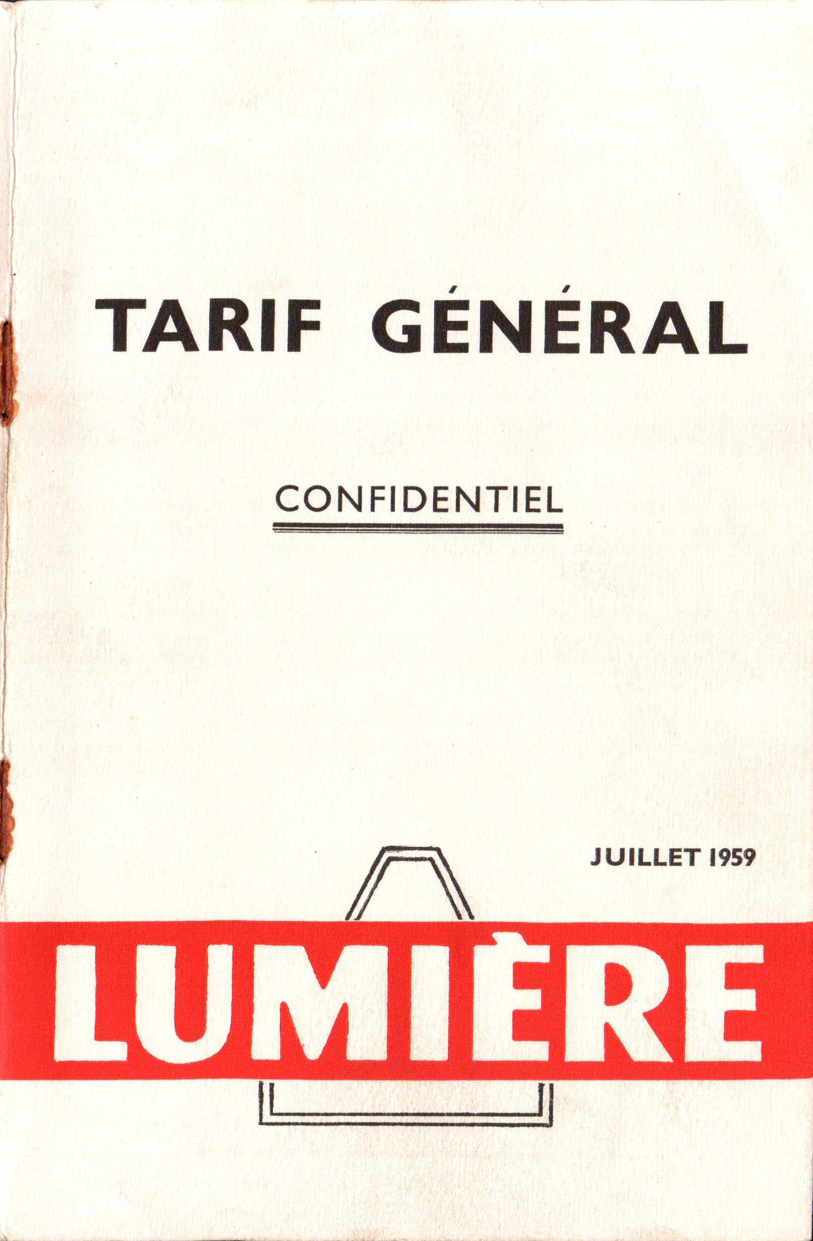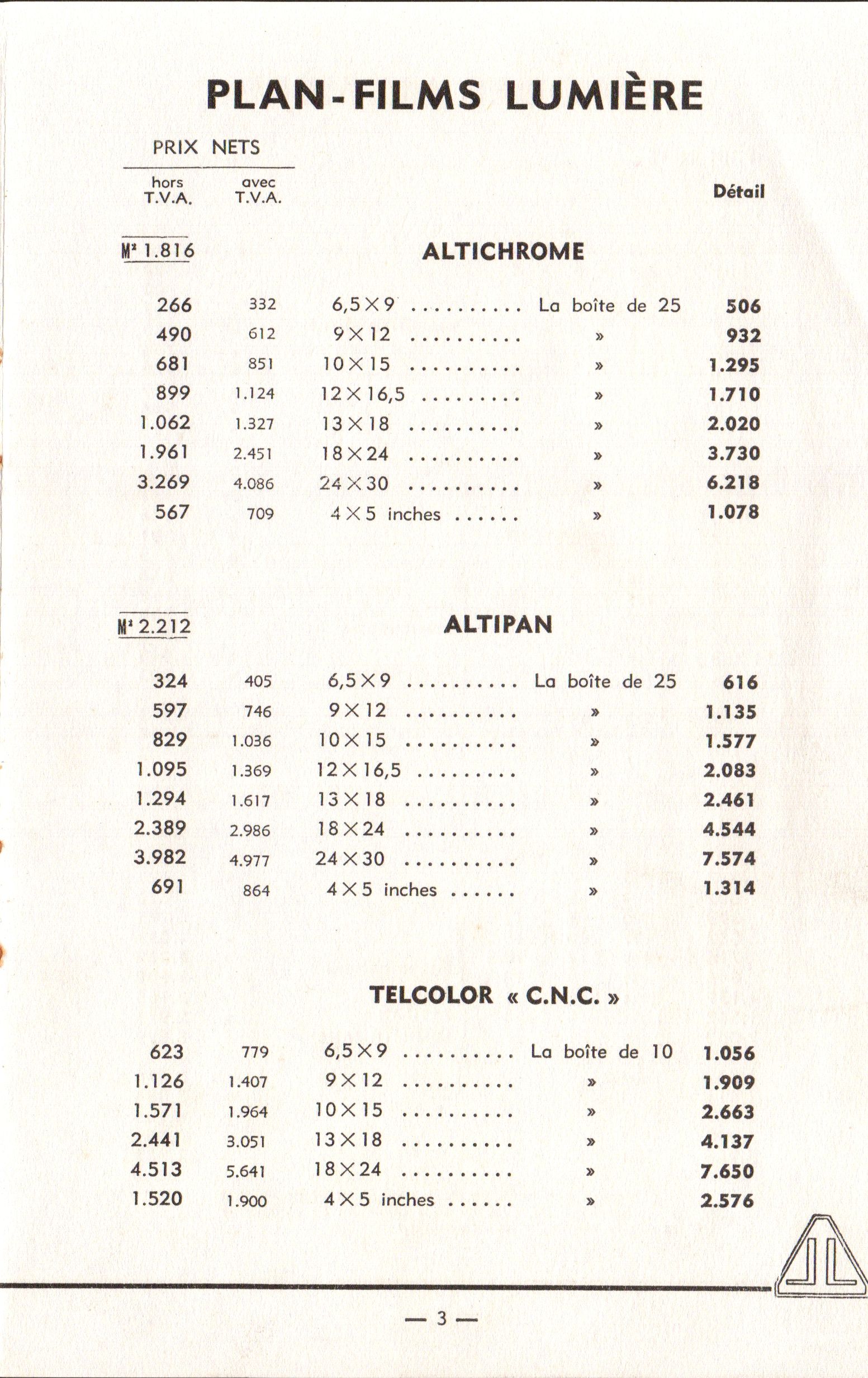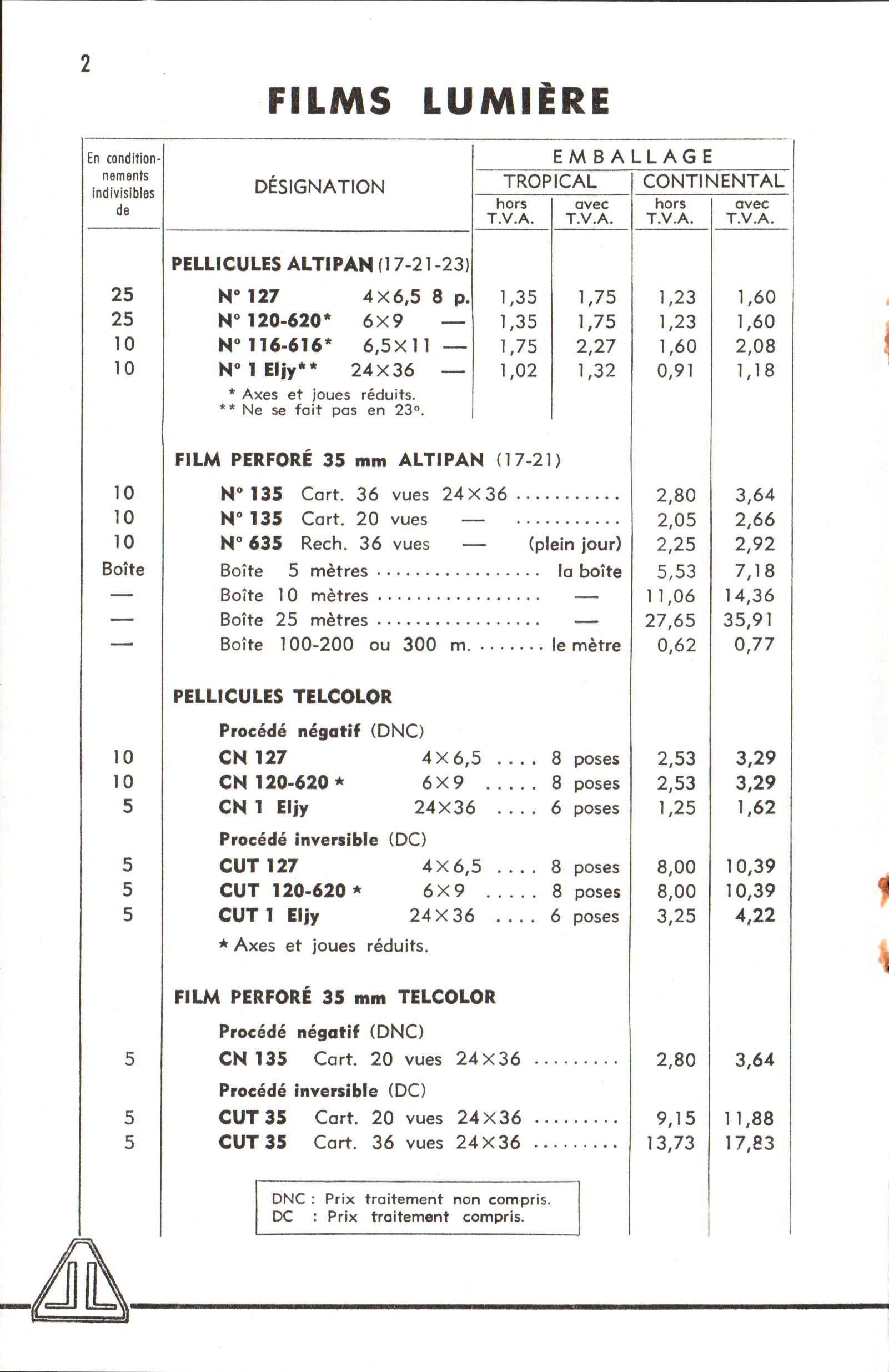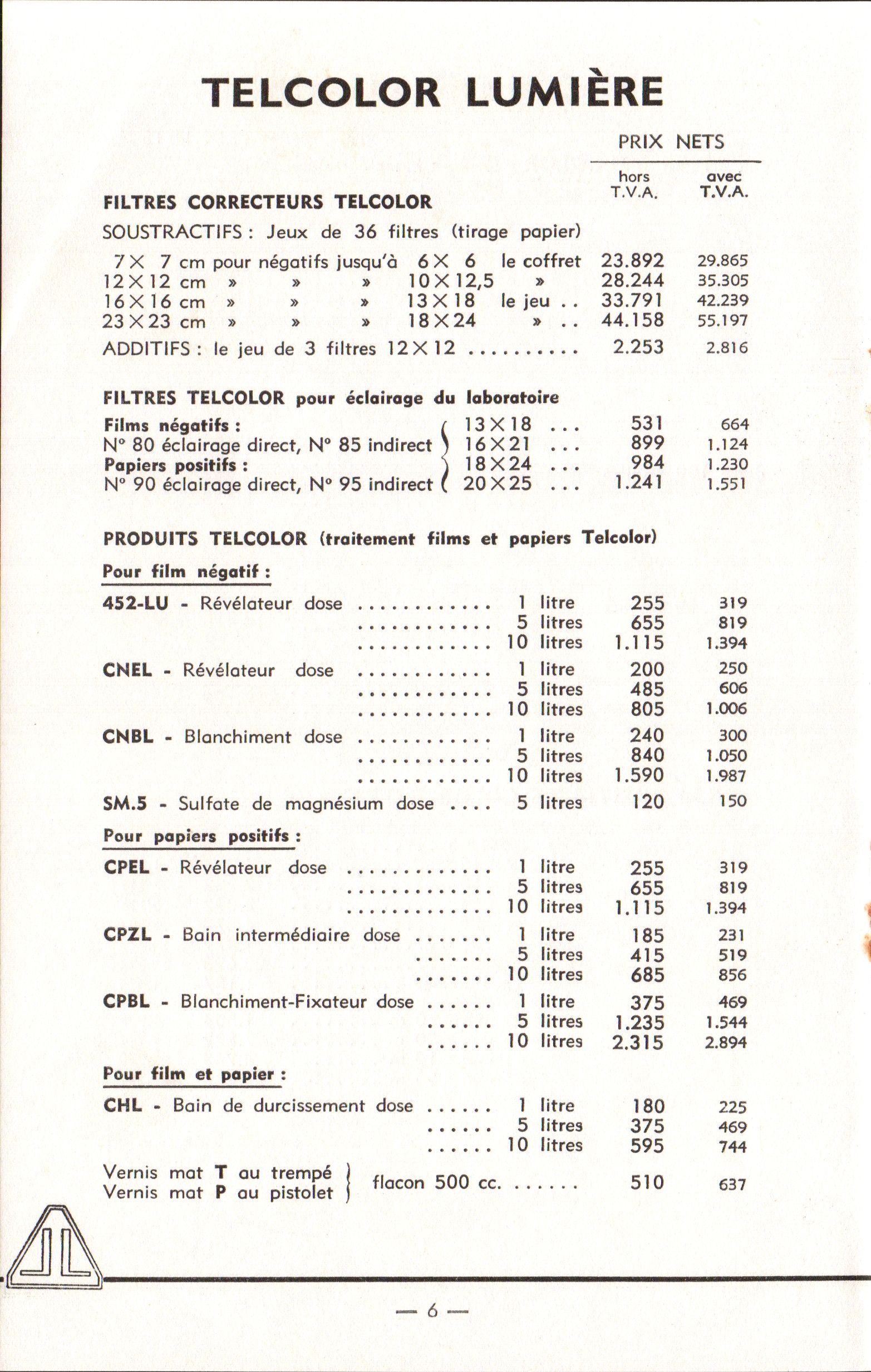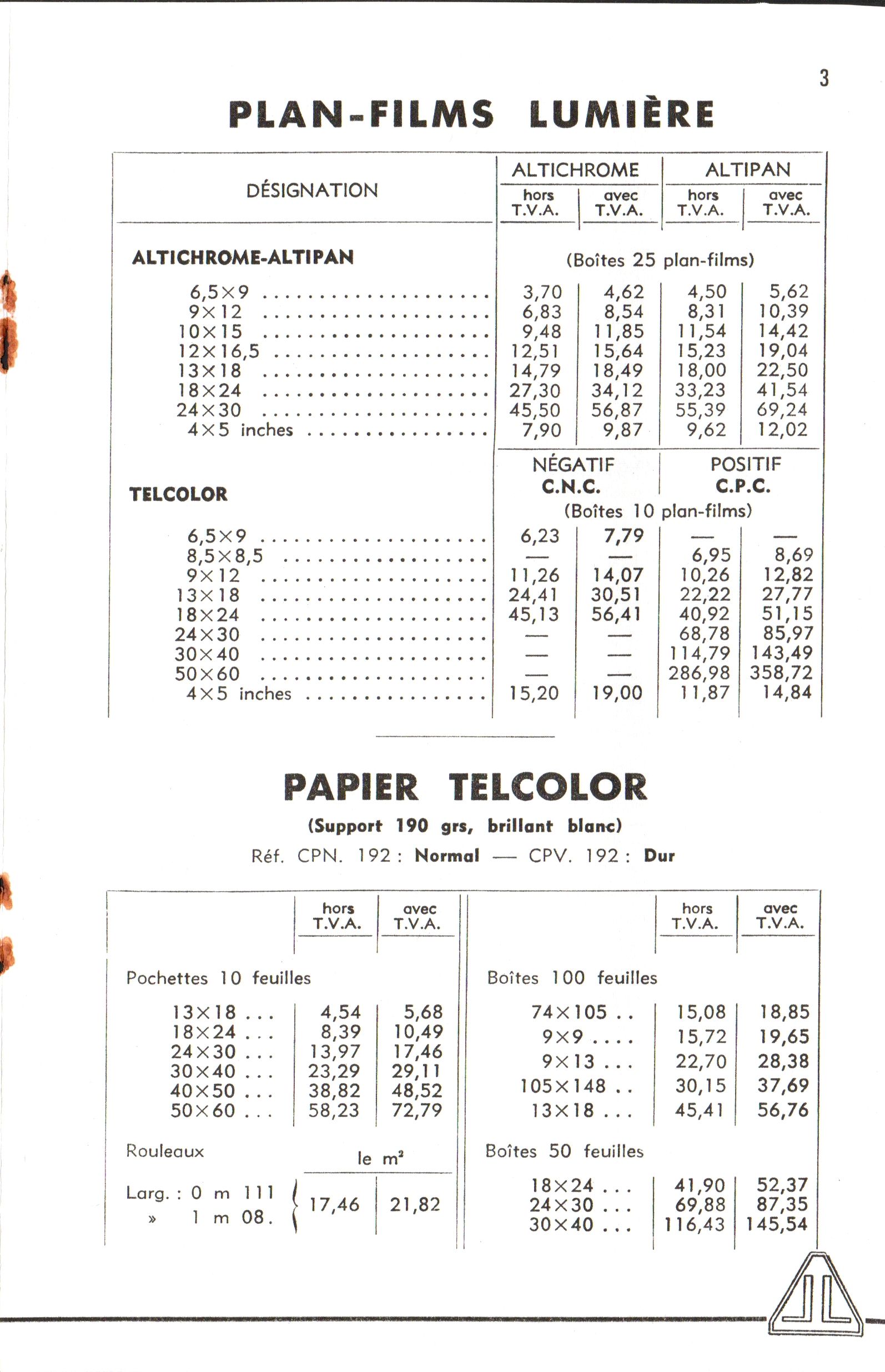 Tarif Films Papiers Filtres Produits Telcolor - mai 1955