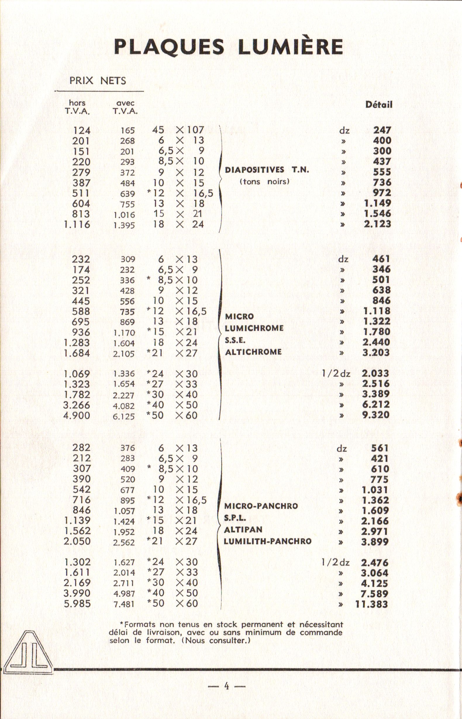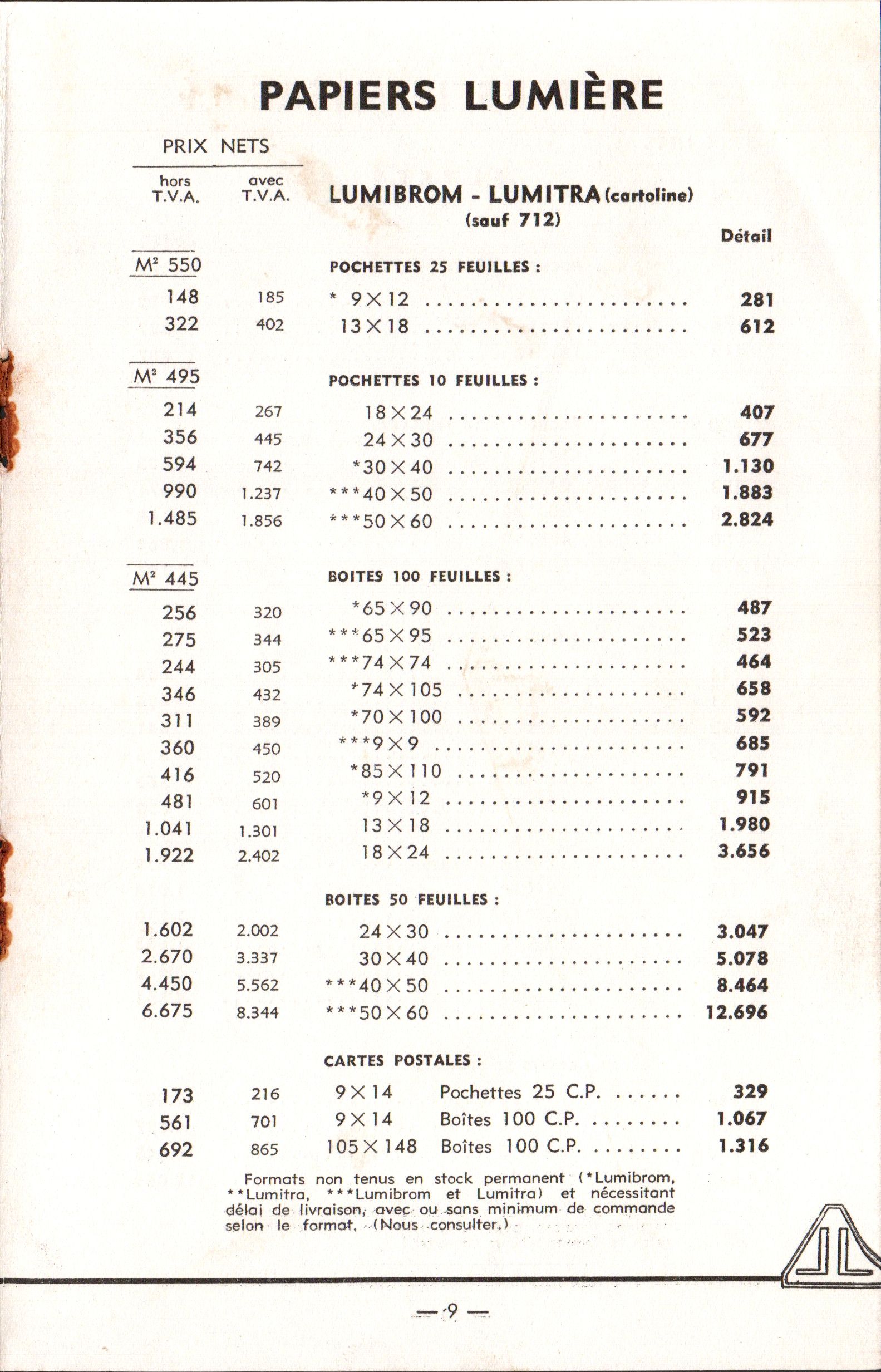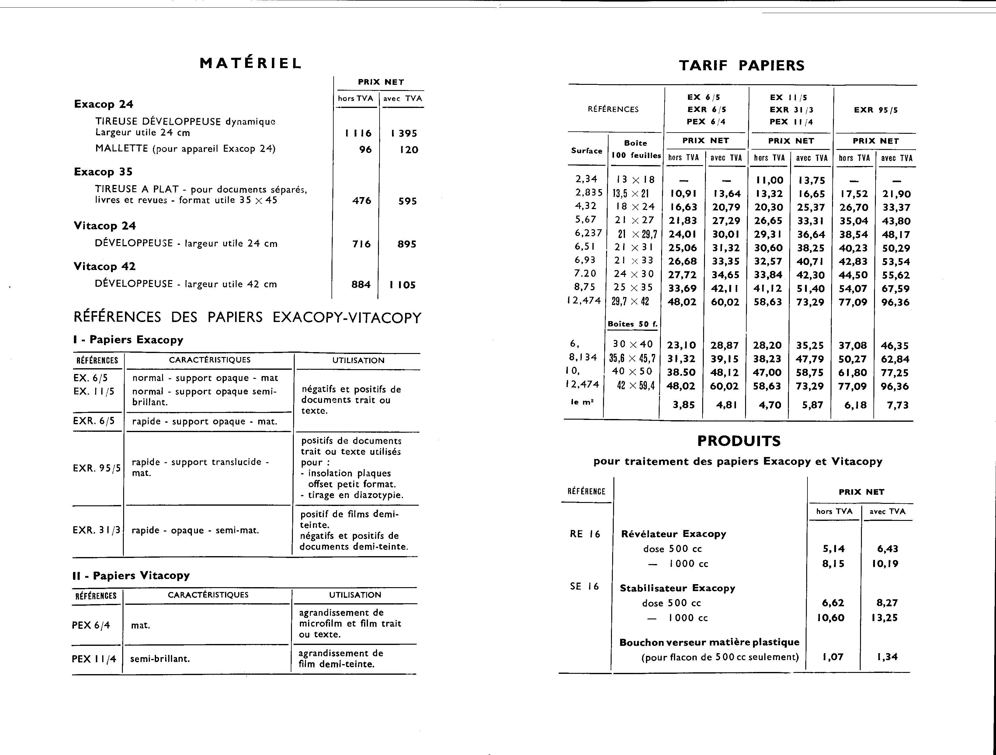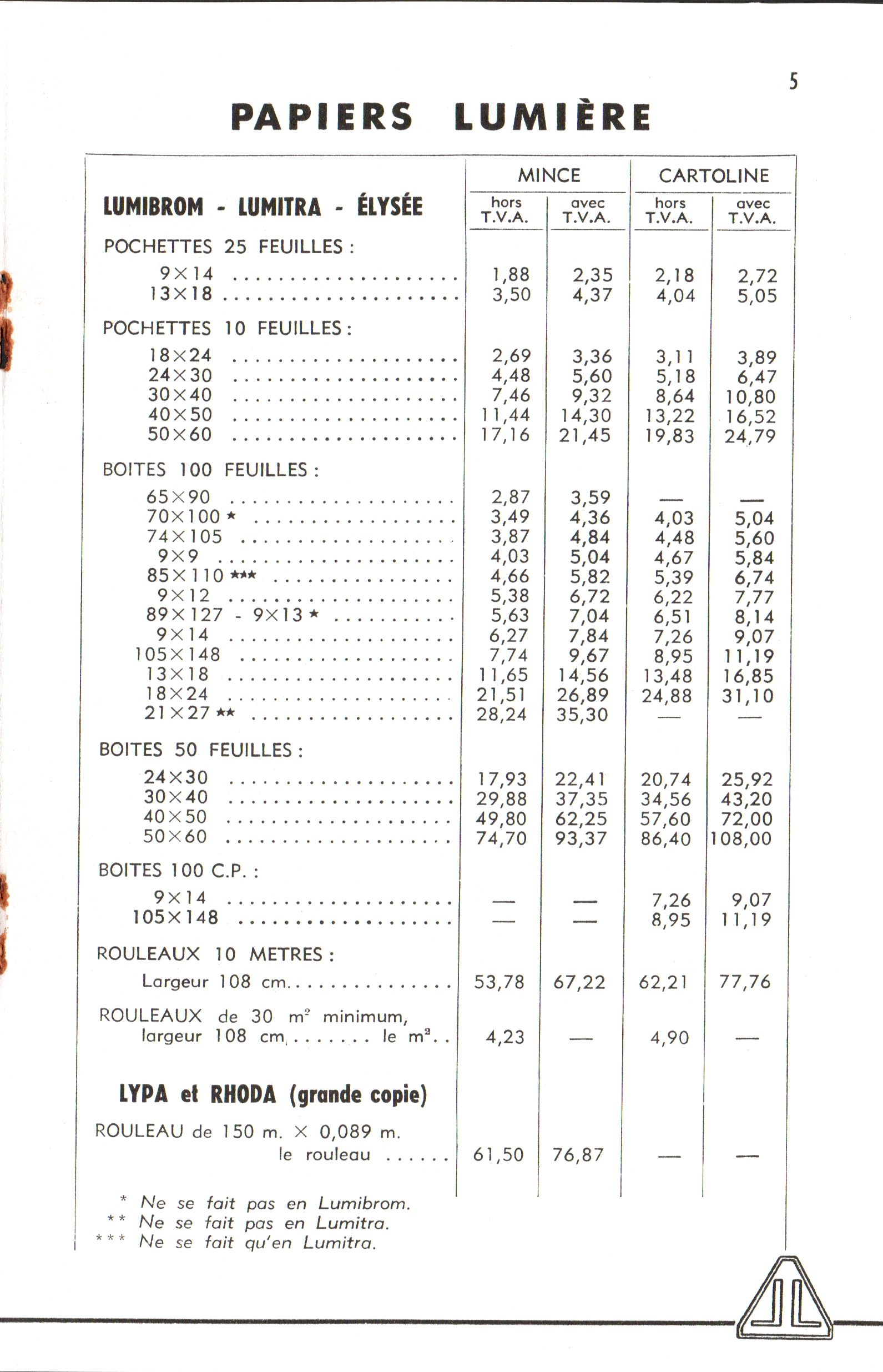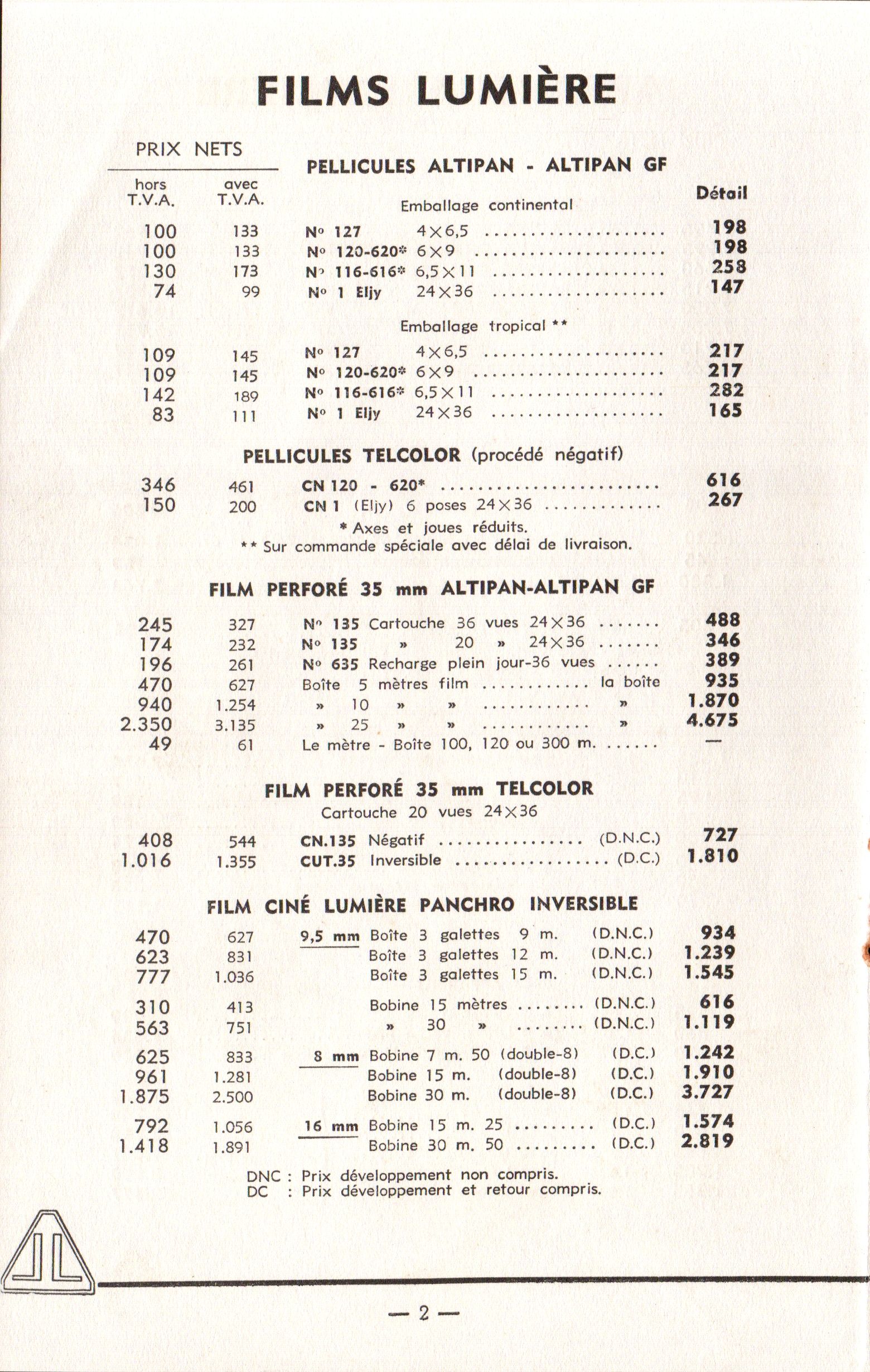 Tarif Films Papiers Filtres Produits Telcolor - mai 1955