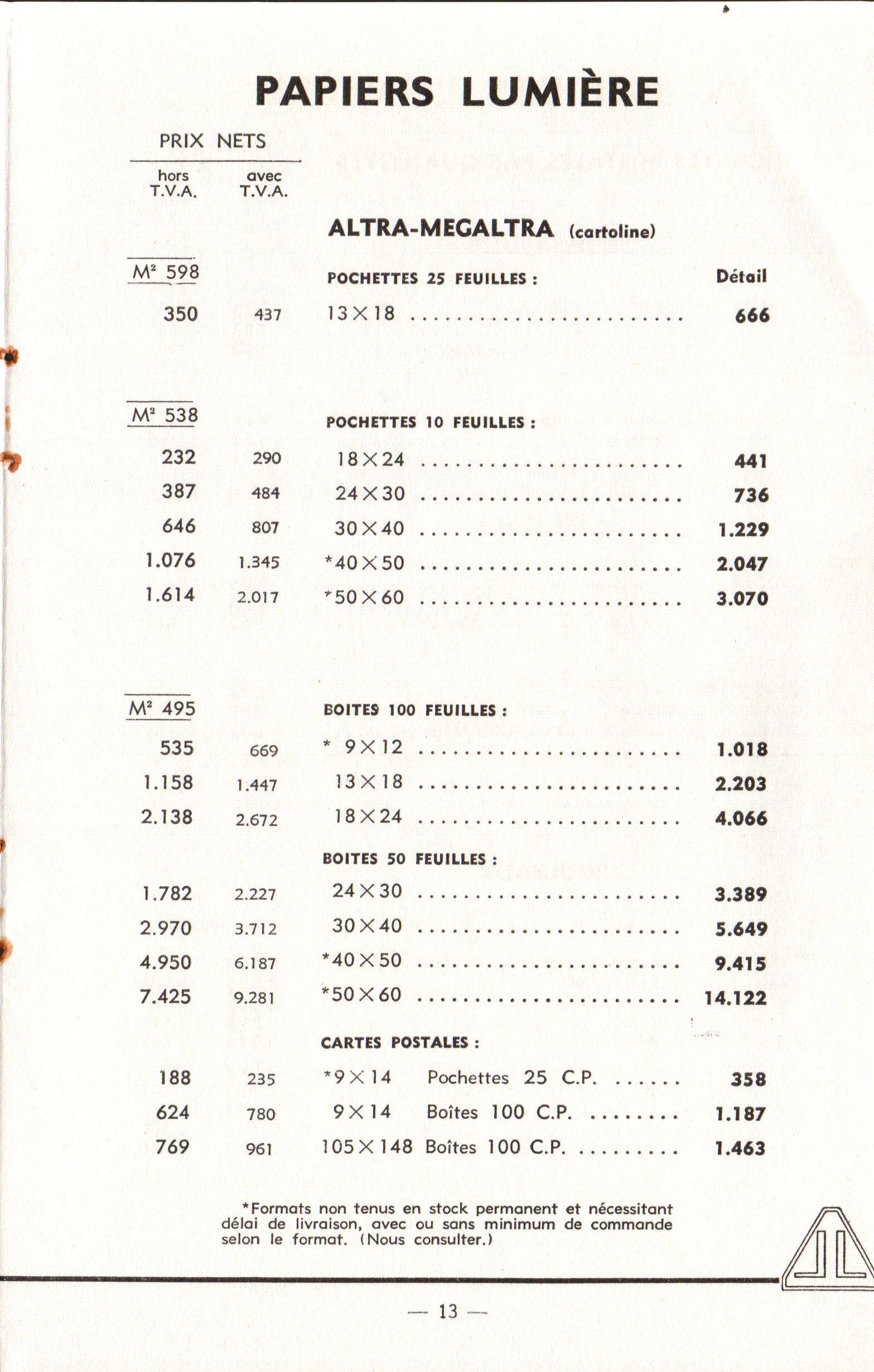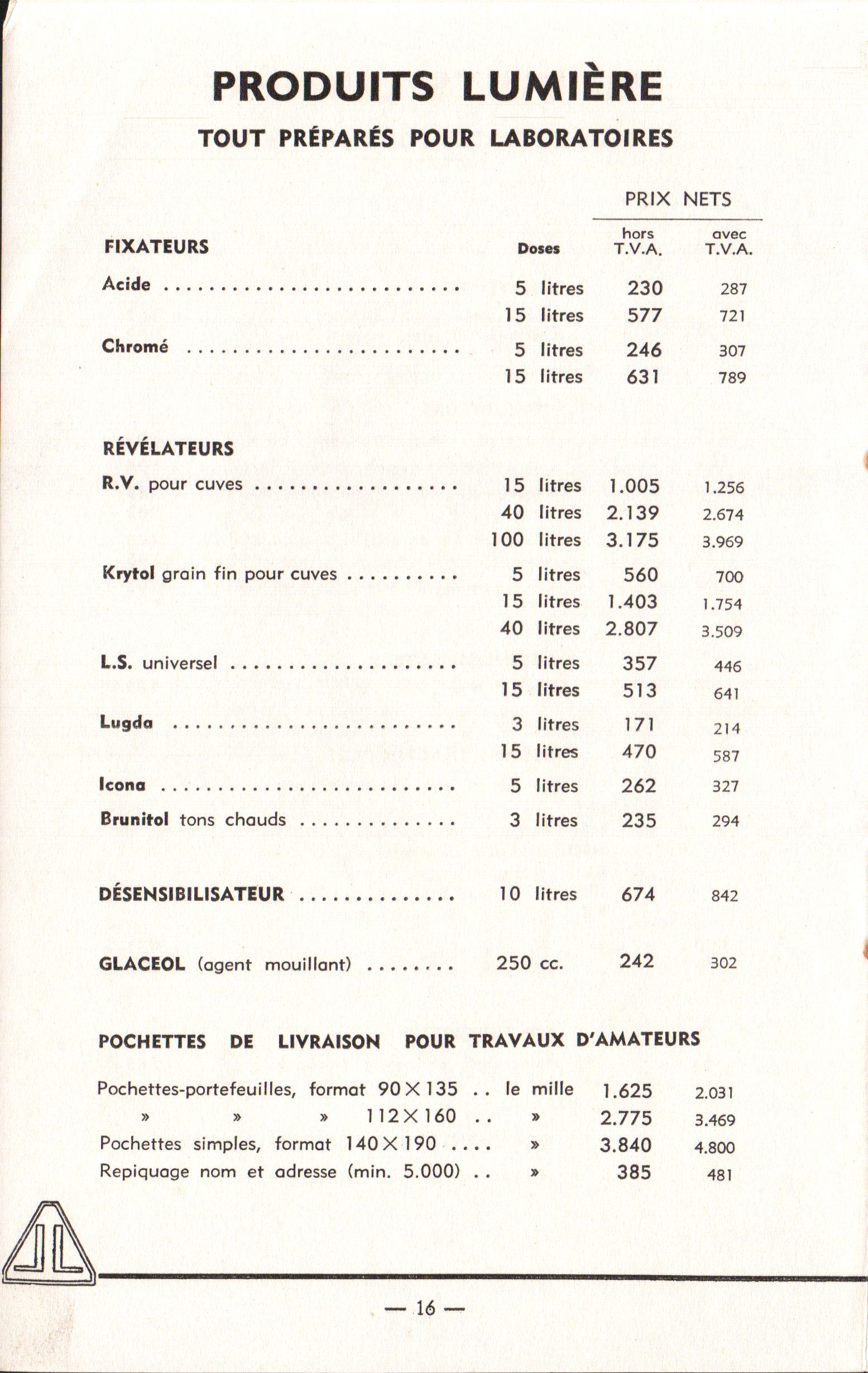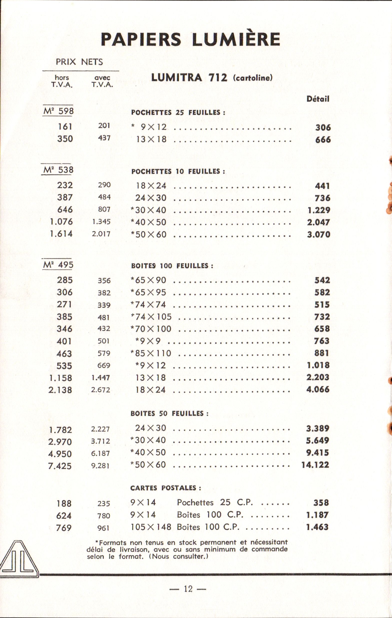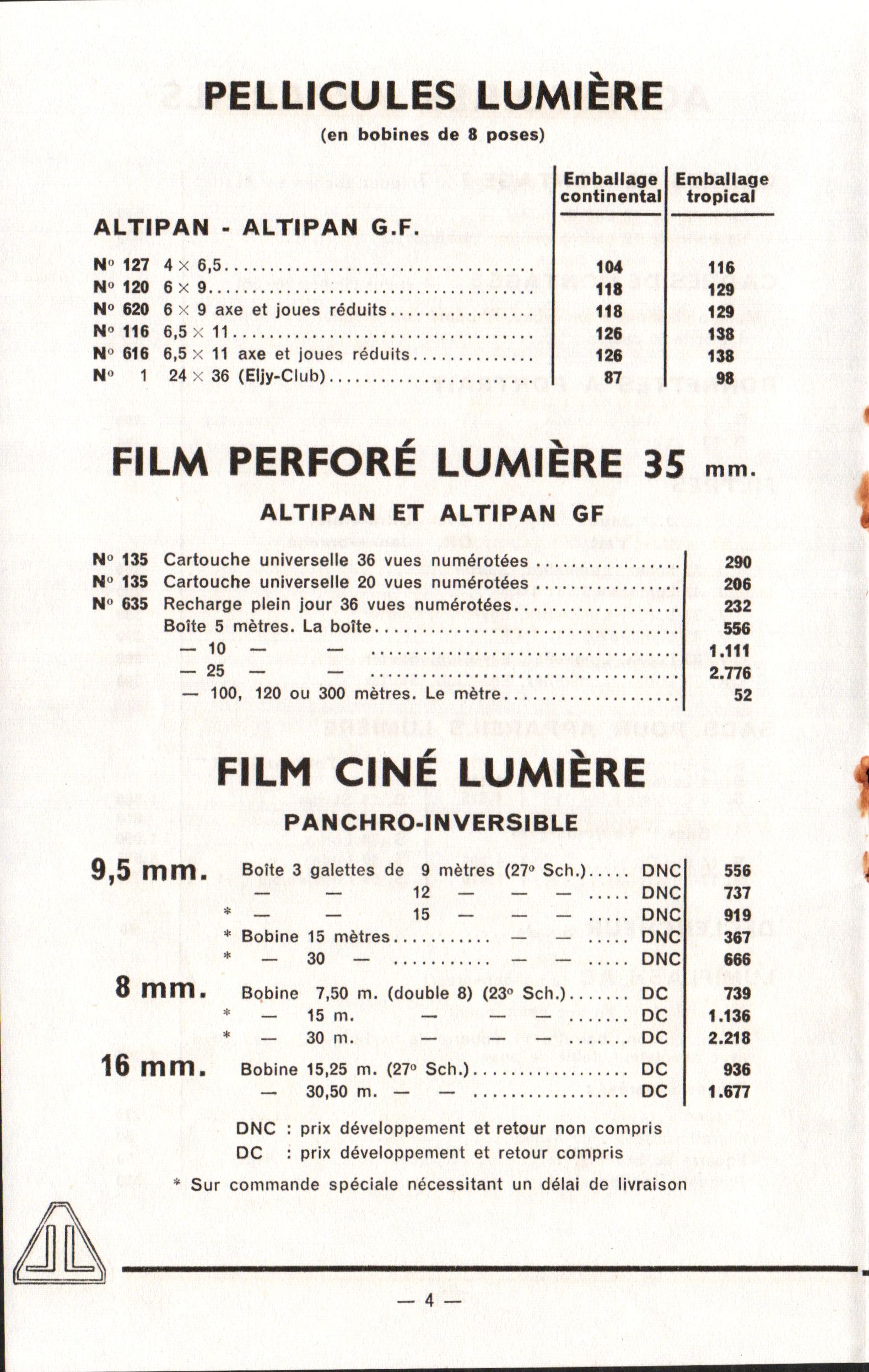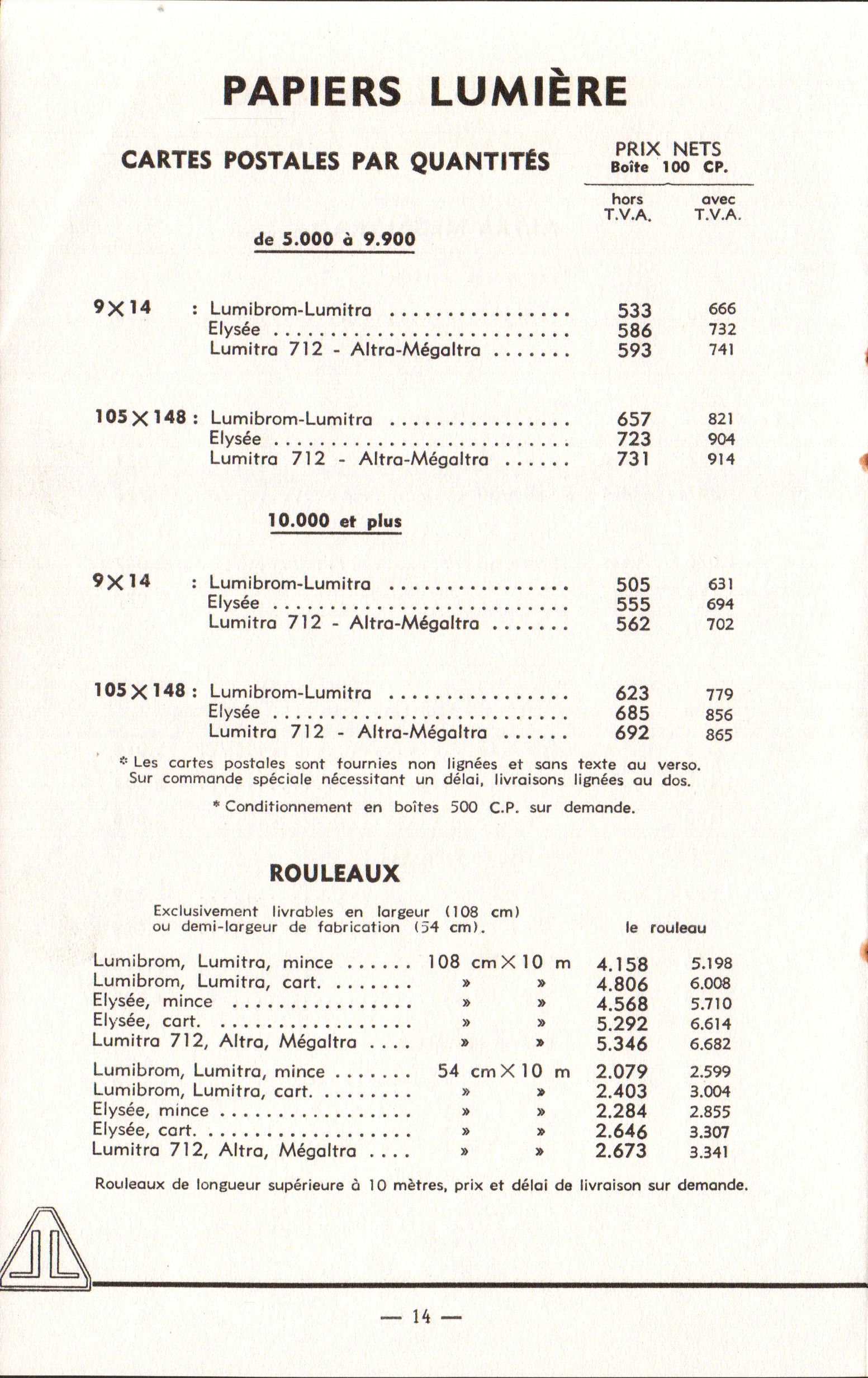 Tarif Films Papiers Filtres Produits Telcolor - mai 1955