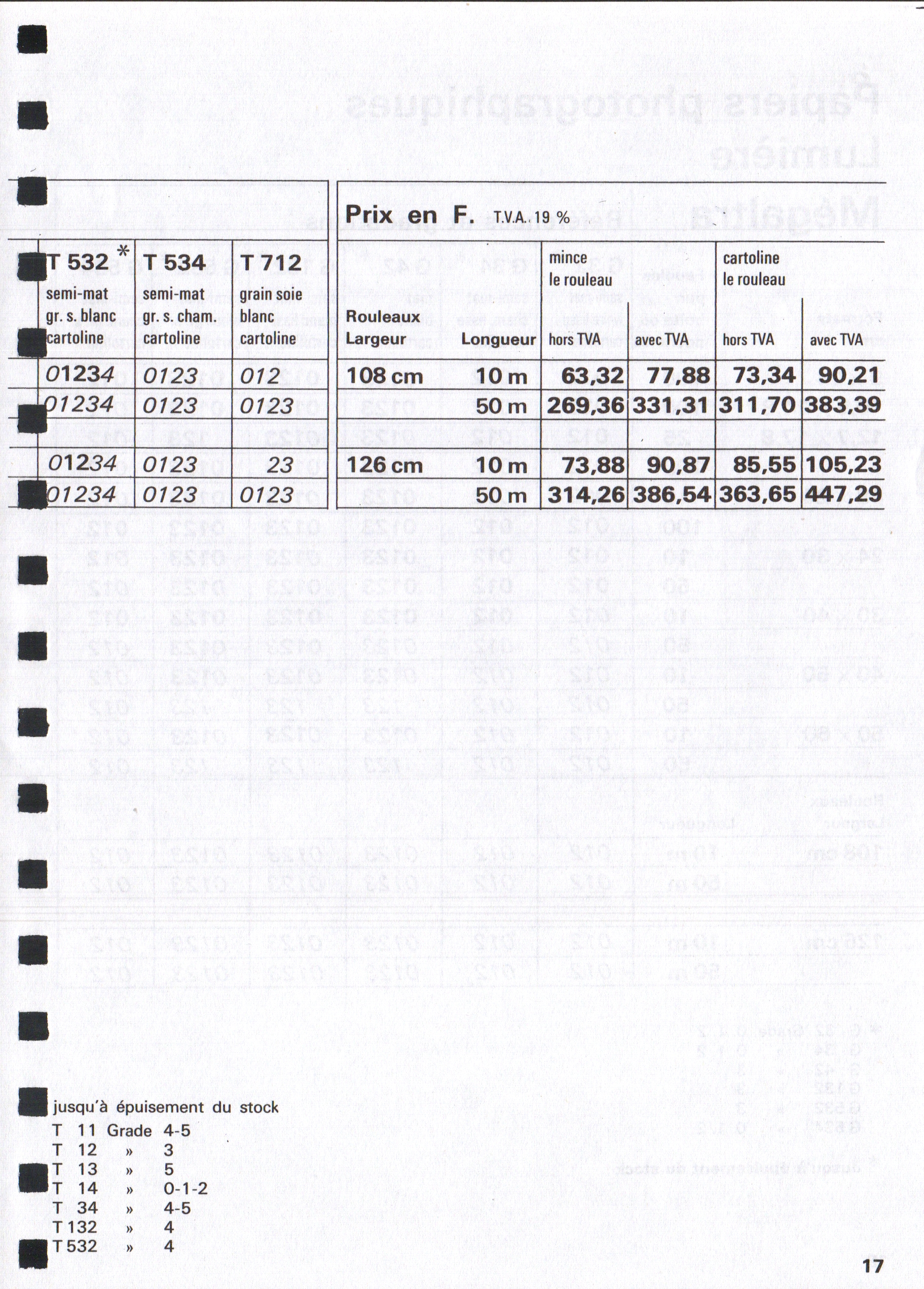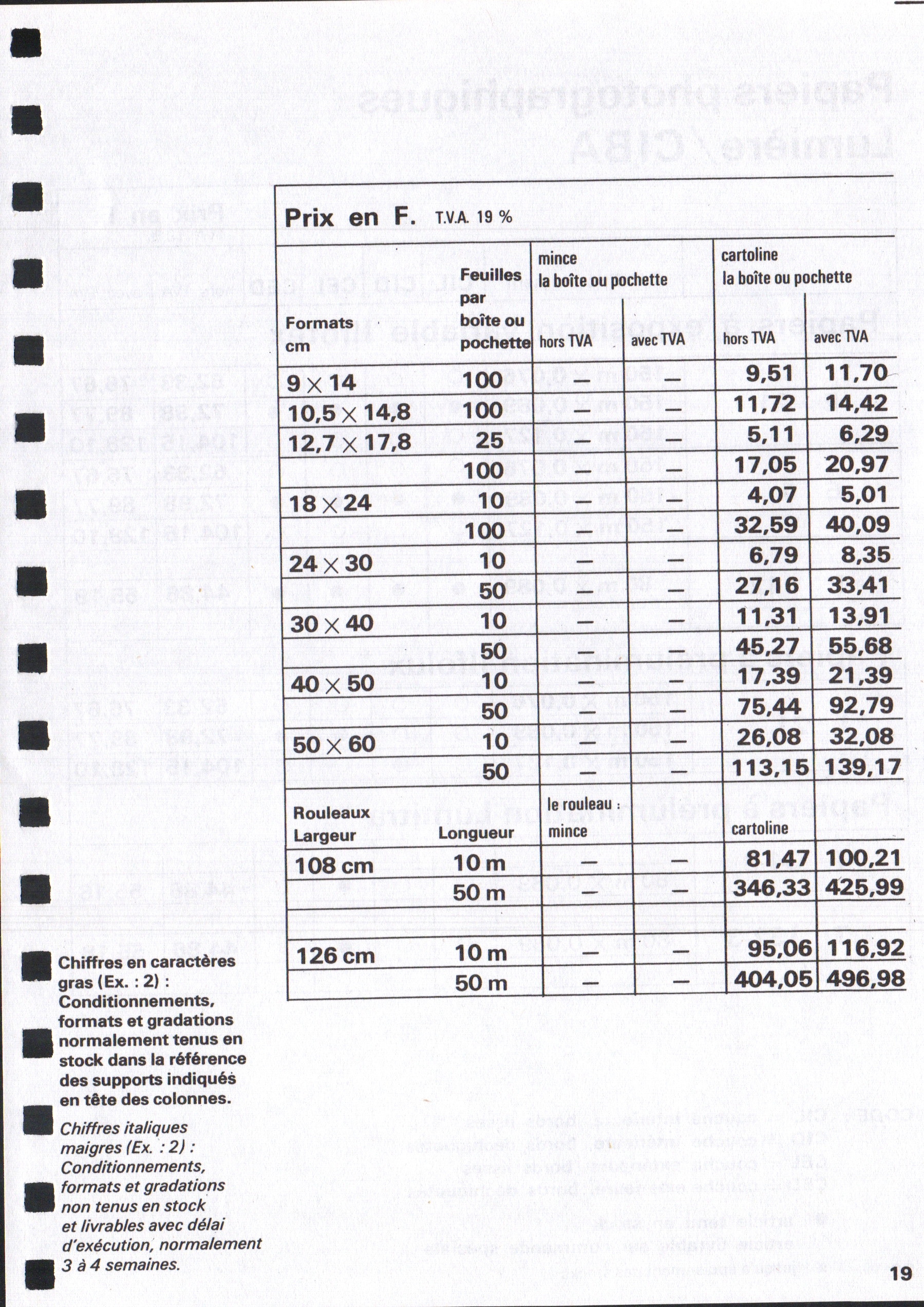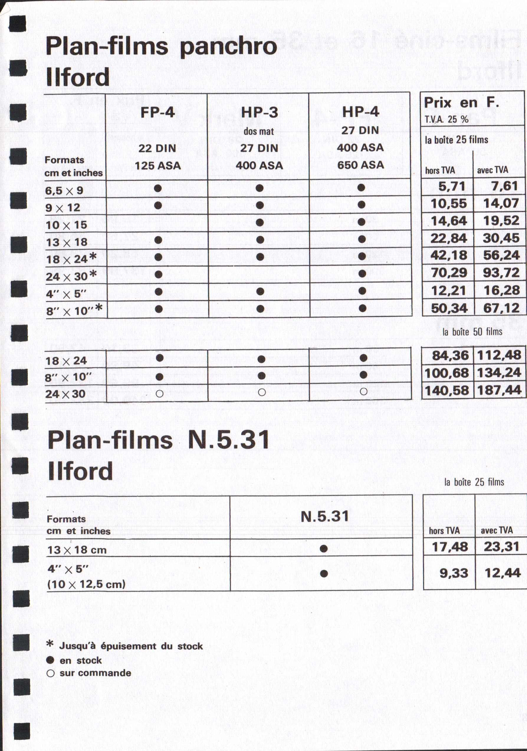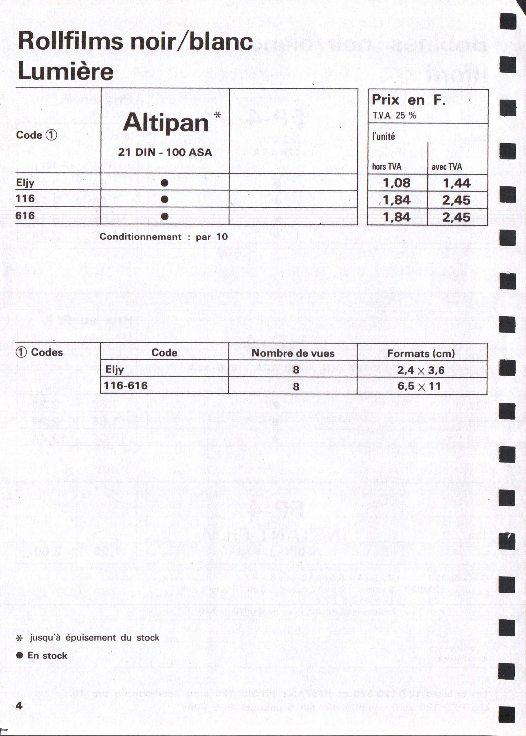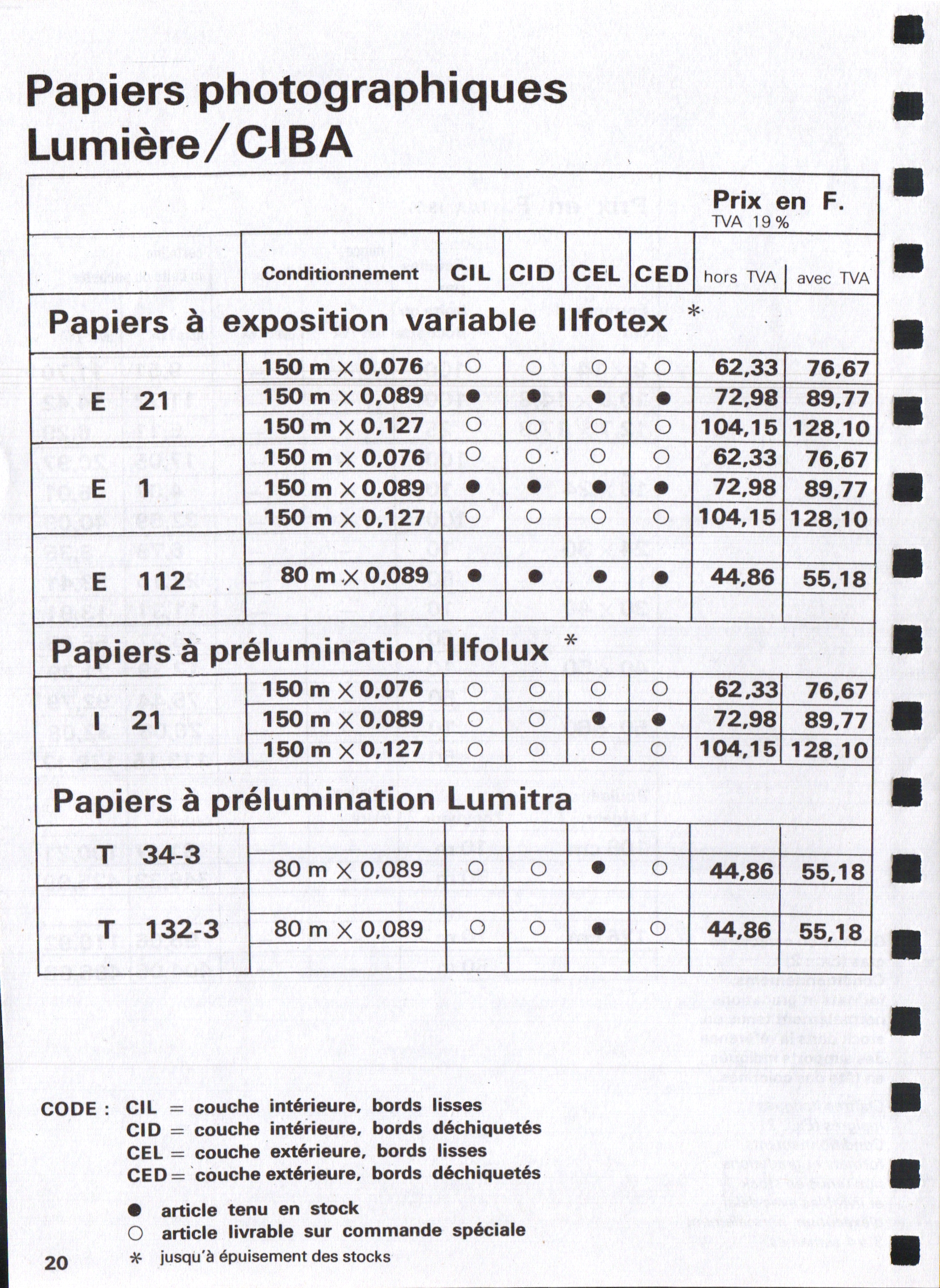 Tarif Films Papiers Filtres Produits Telcolor - mai 1955