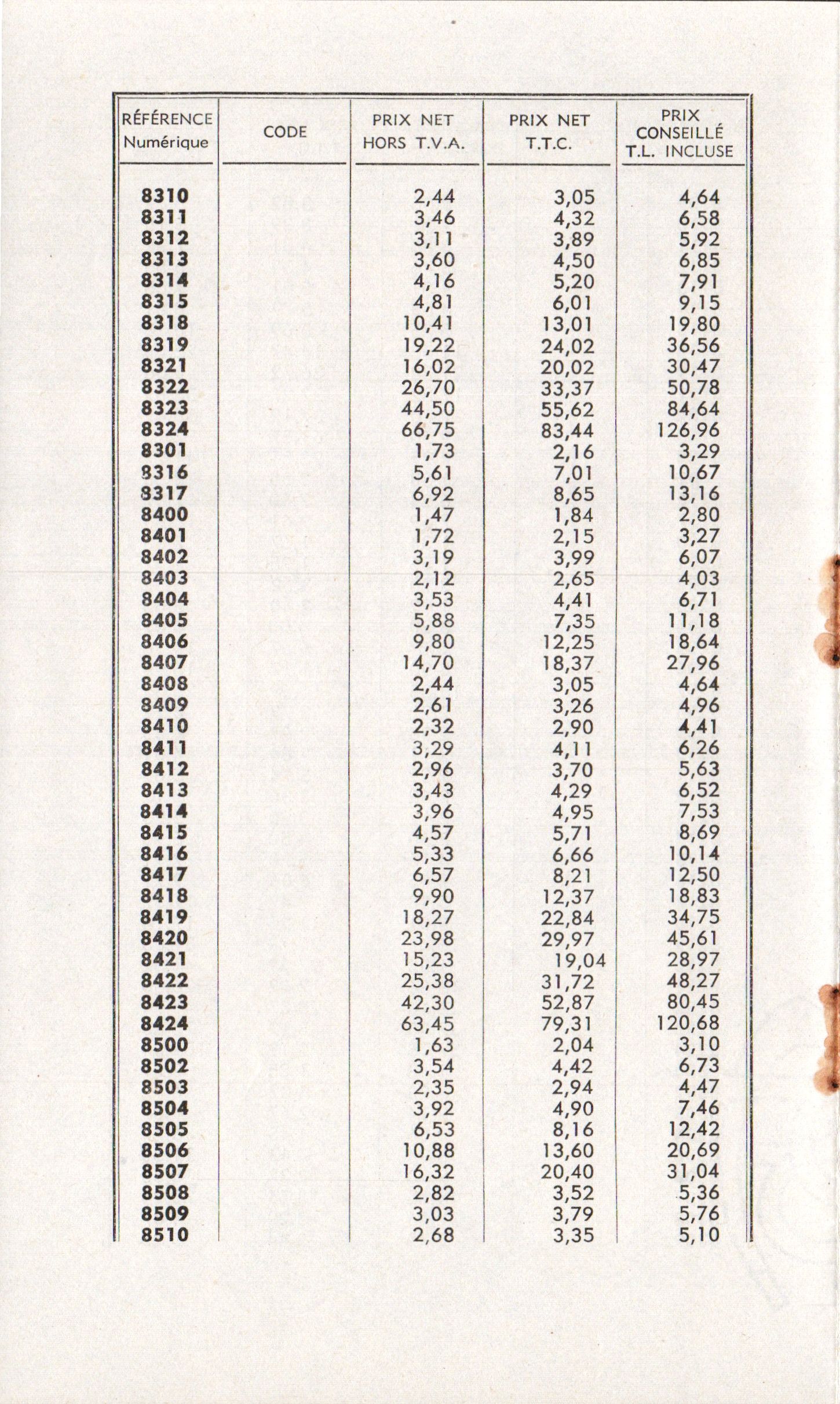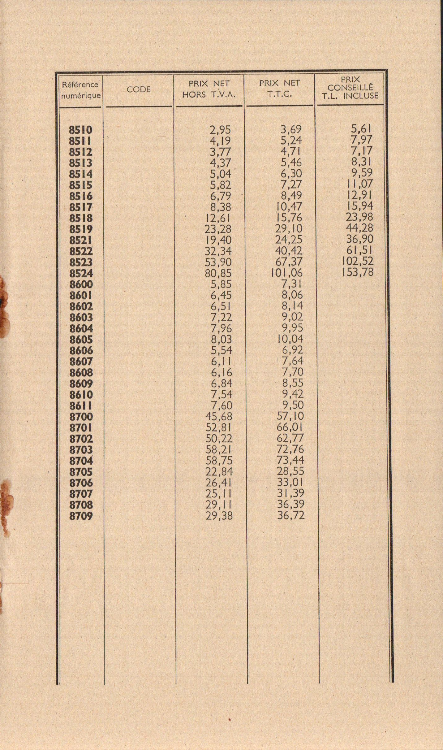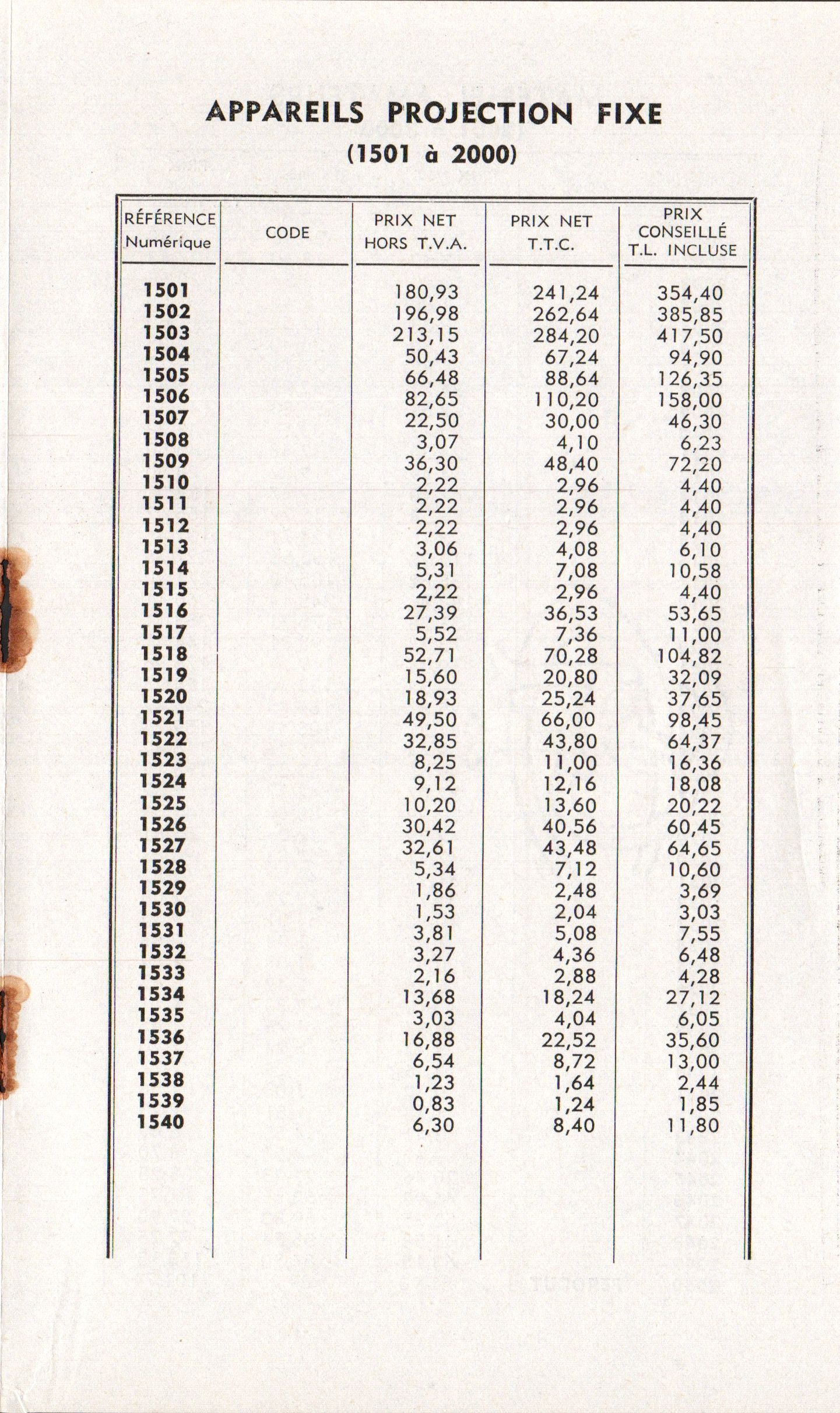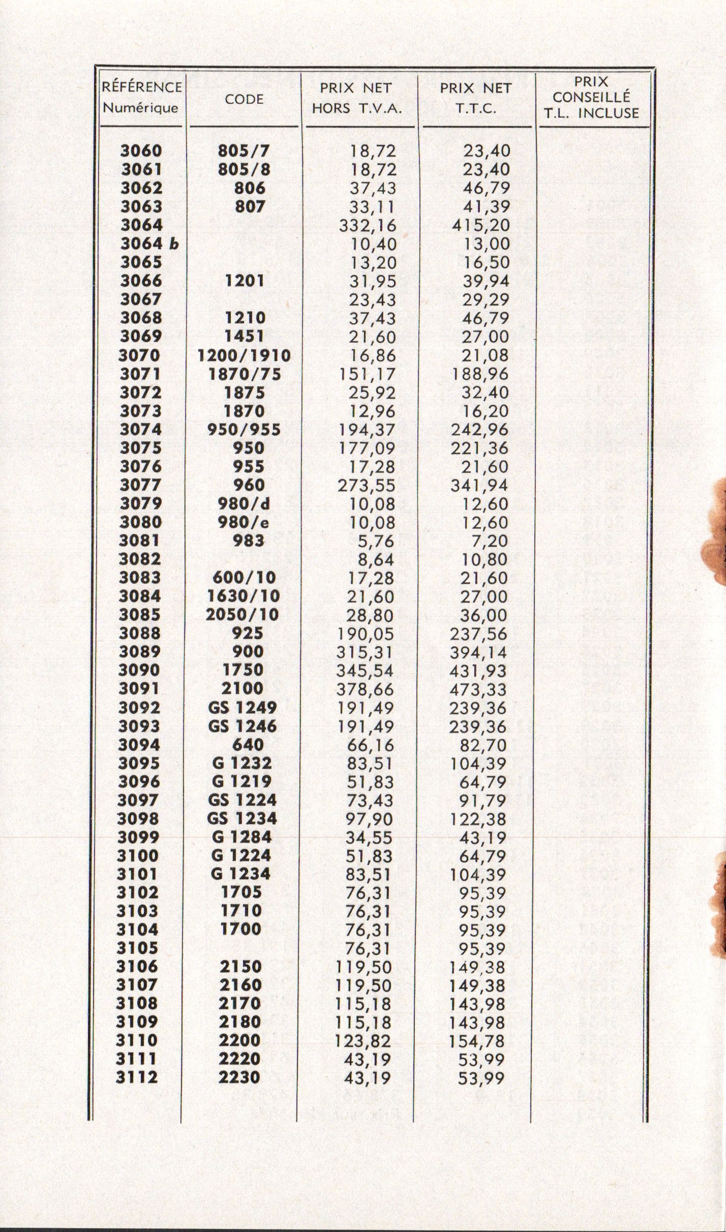 Tarif appareils et accessoires - mars 1960
