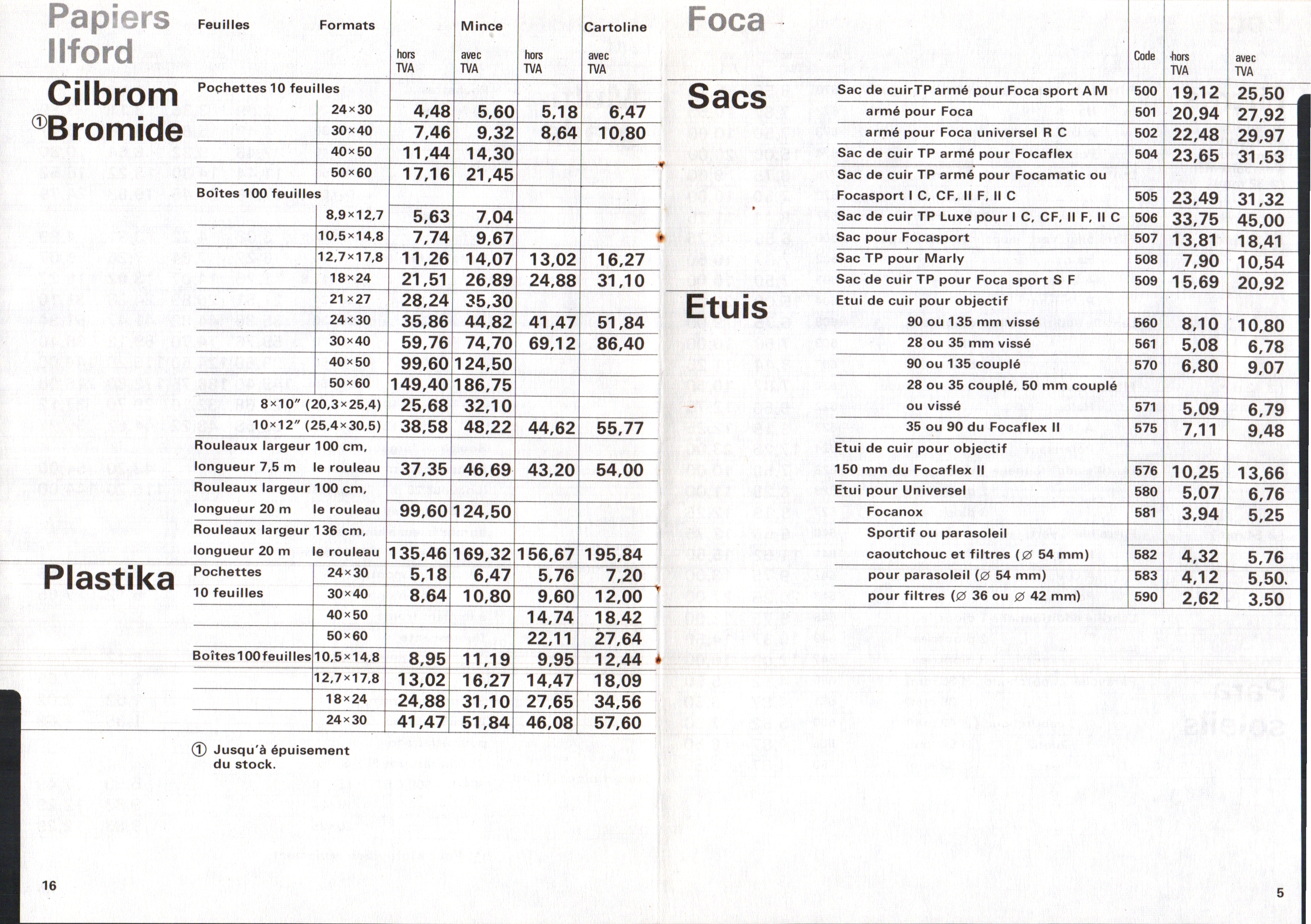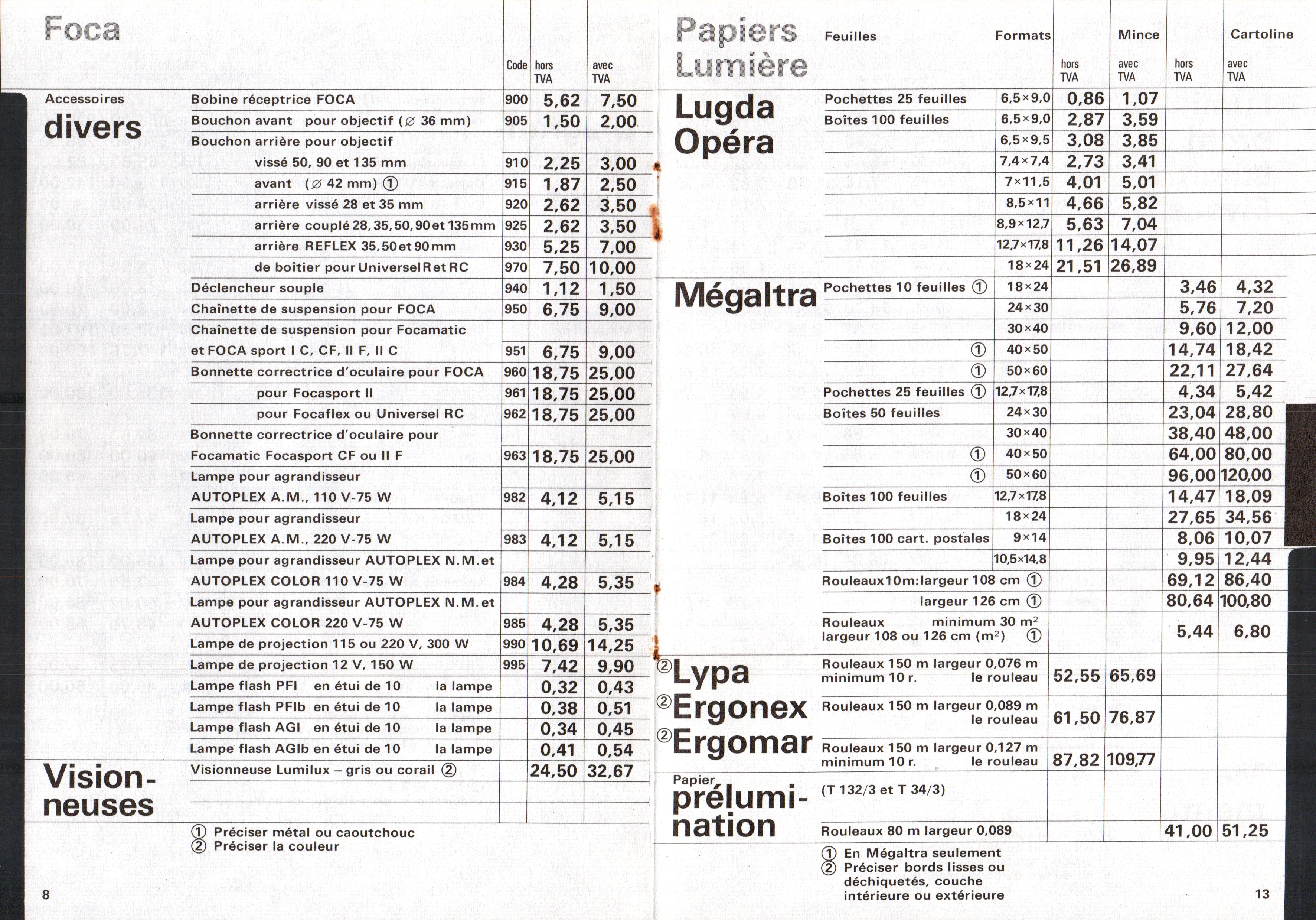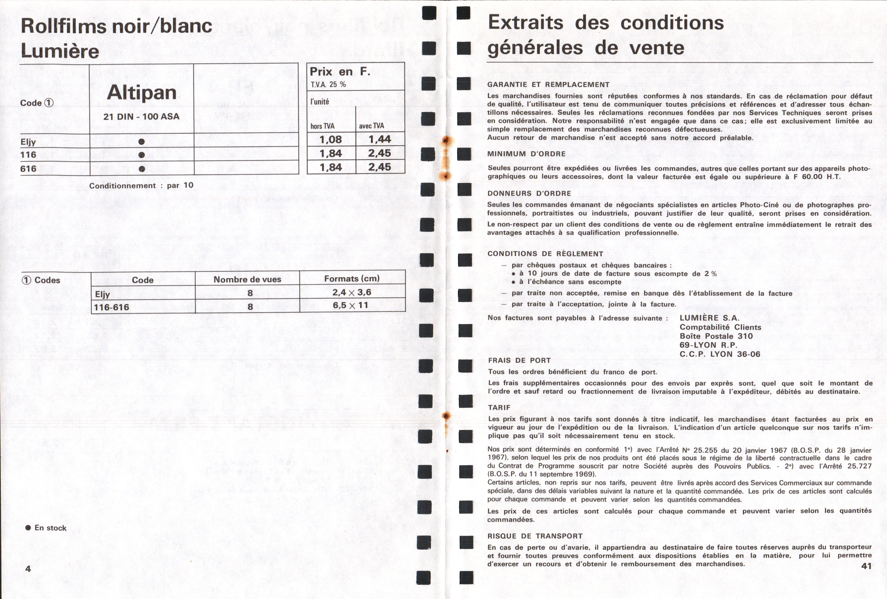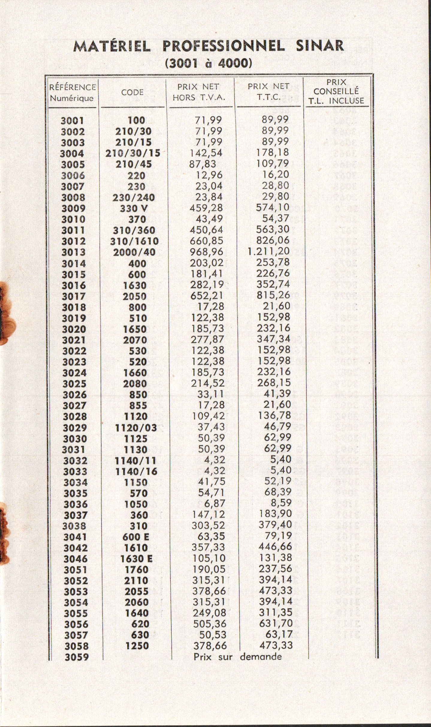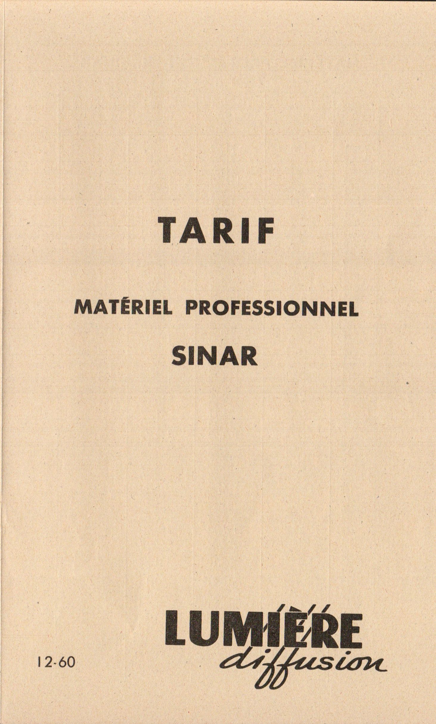 - Tarif matériel professionnel SINAR - décembre 1960