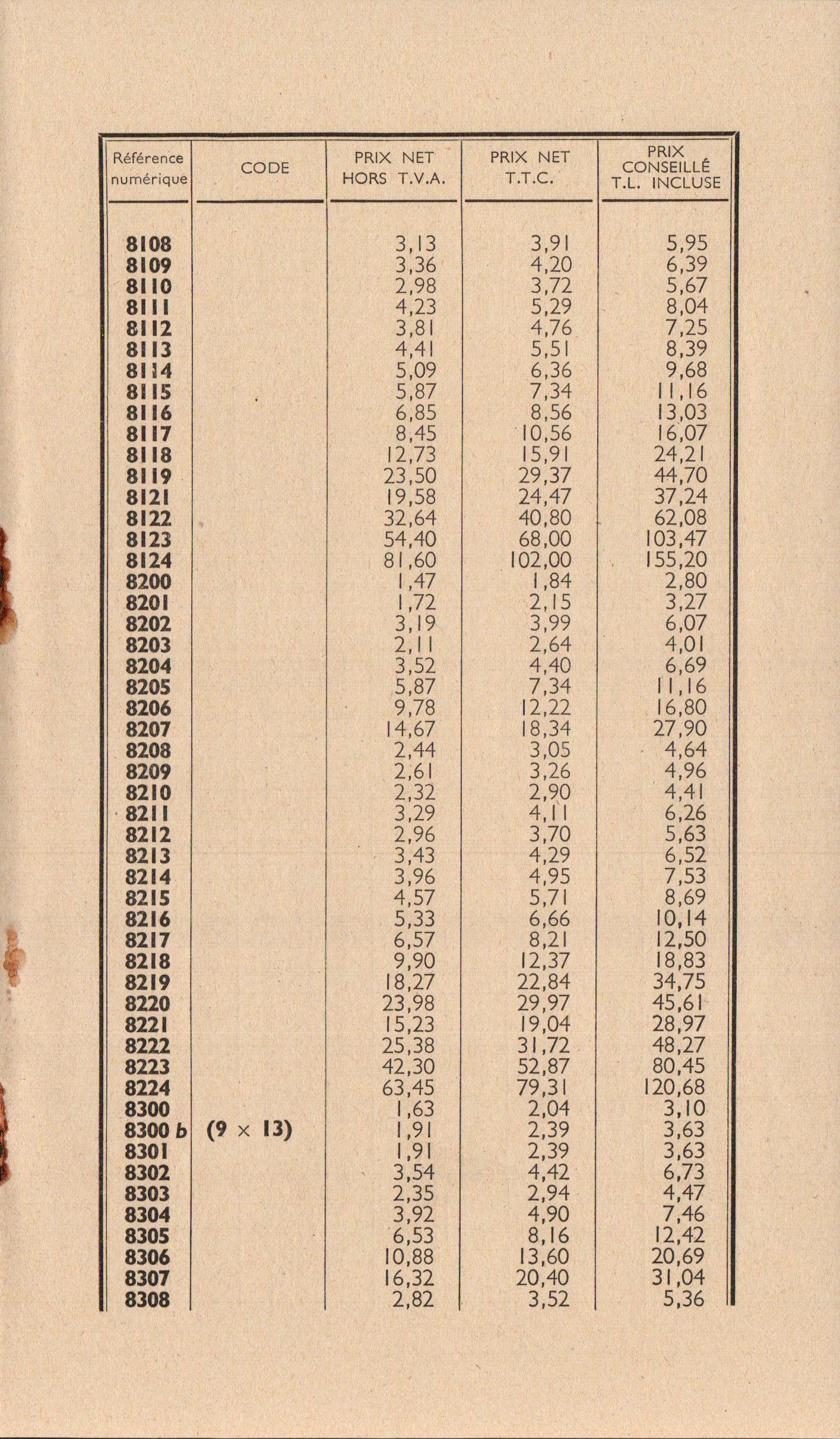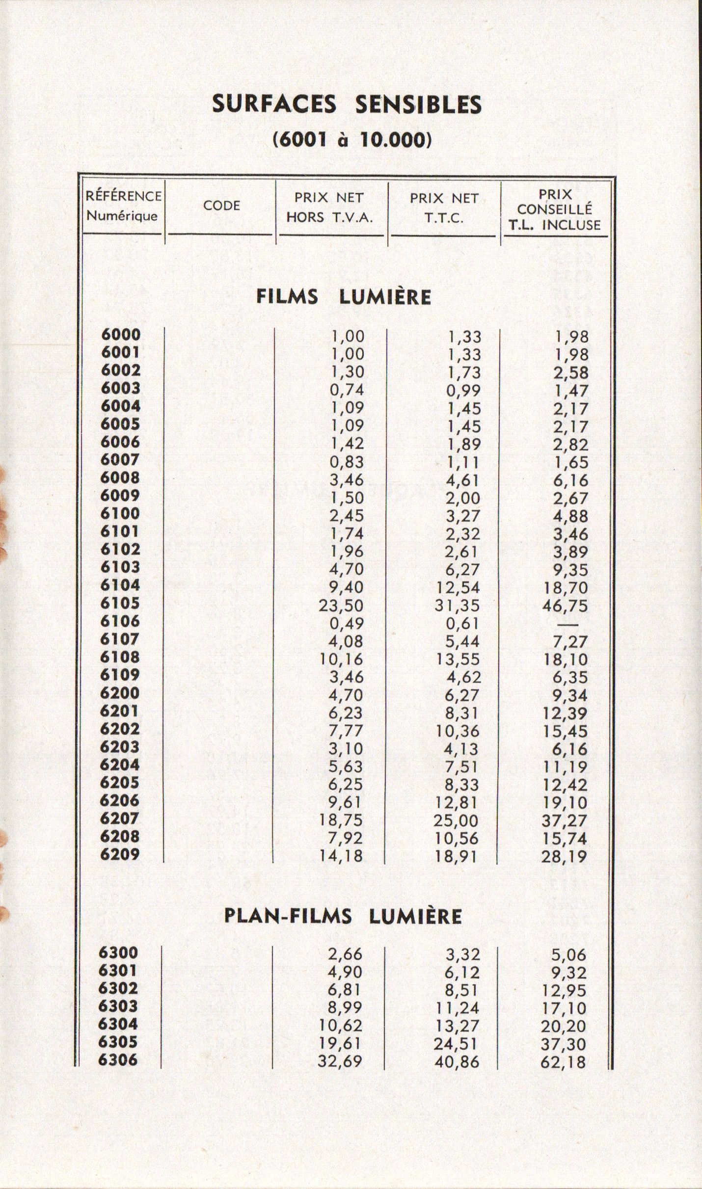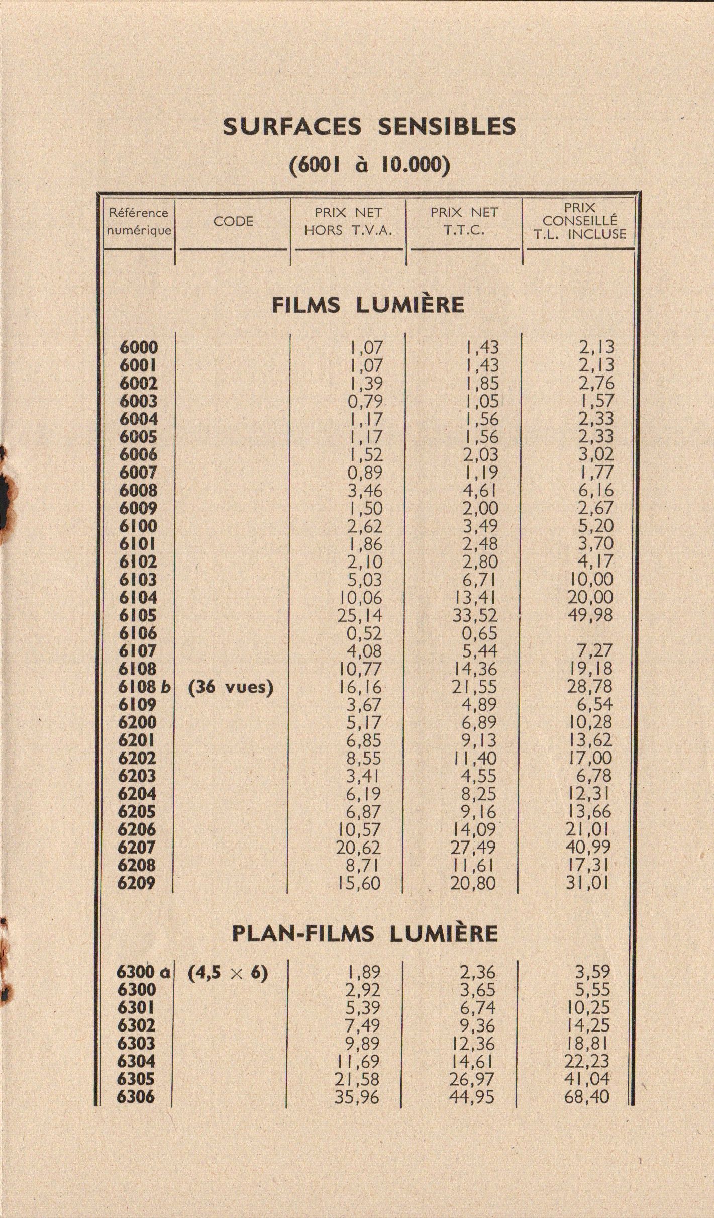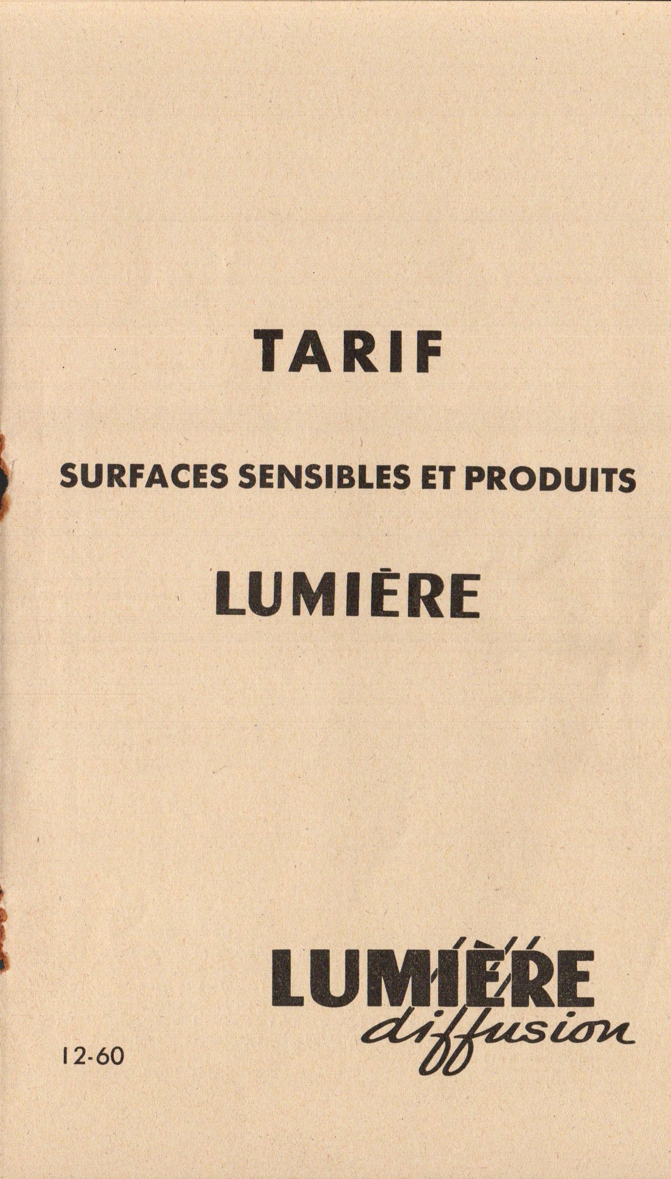- Tarif surfaces sensibles et produits - décembre 1960