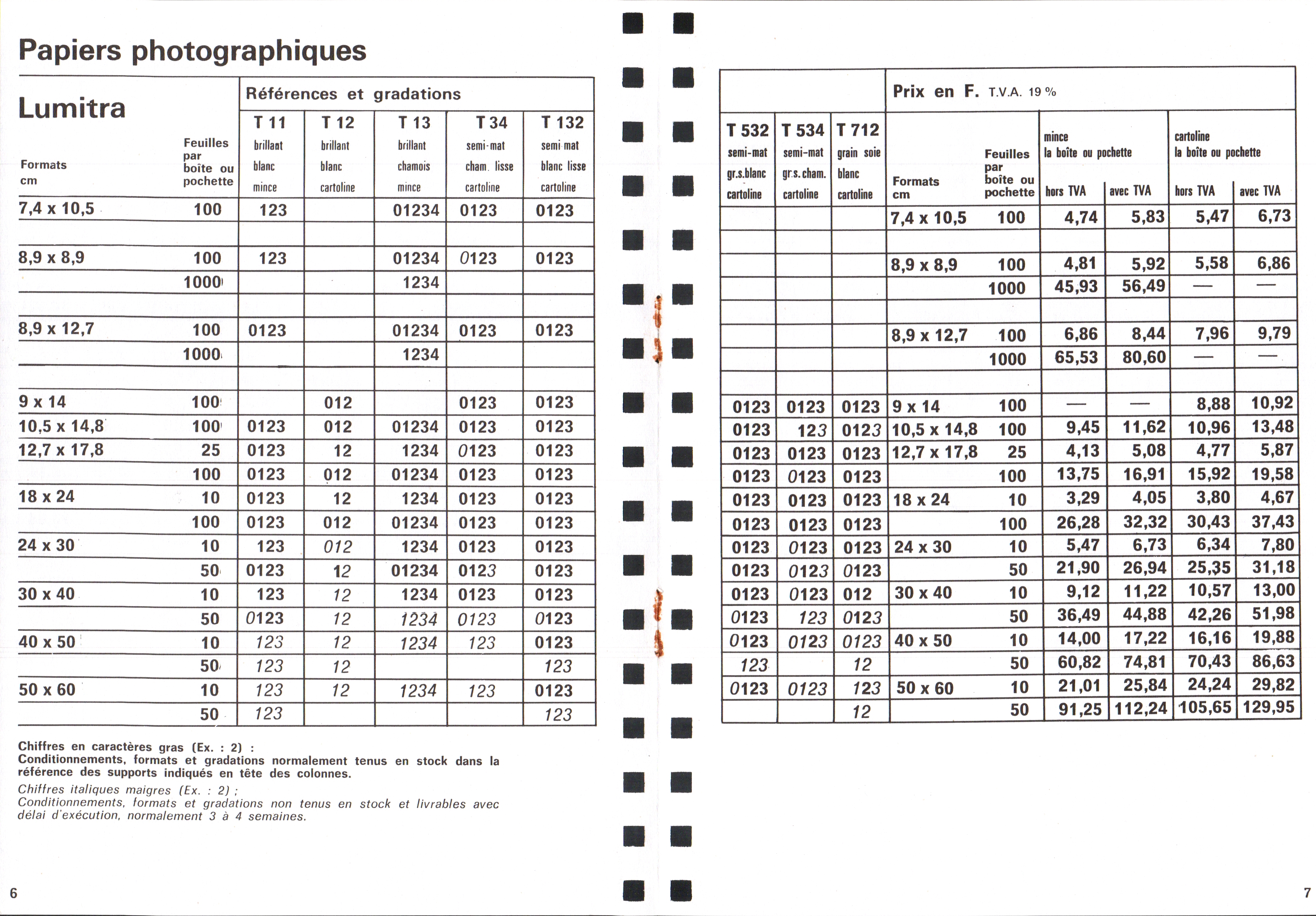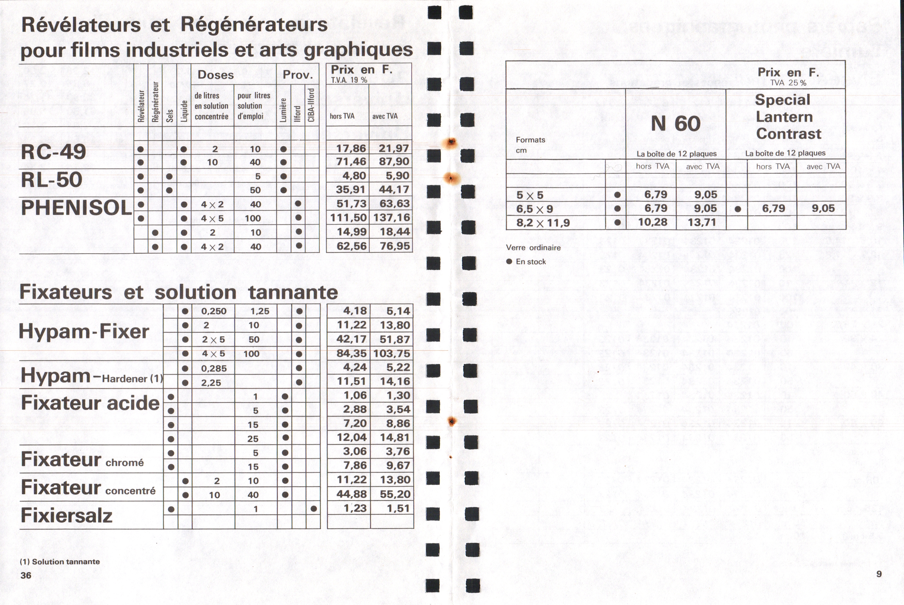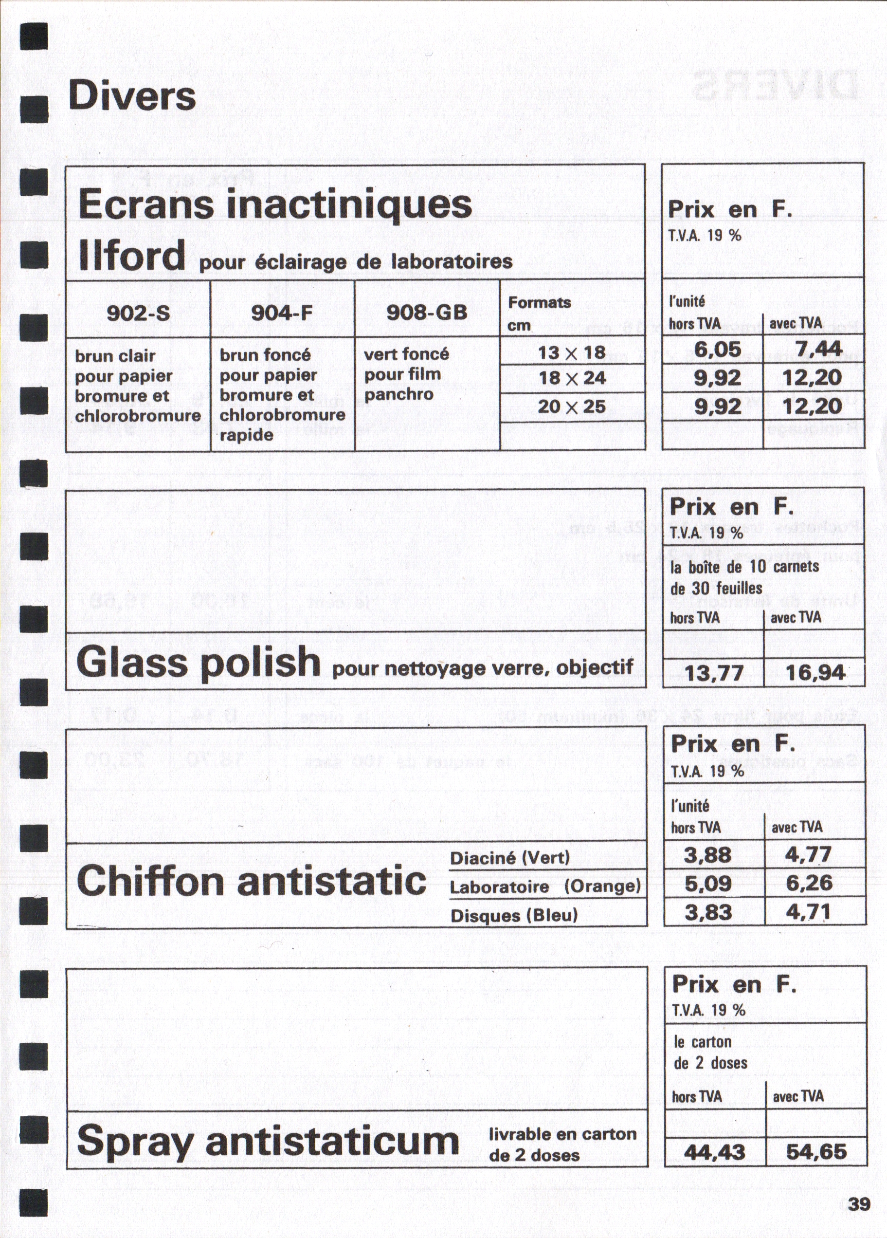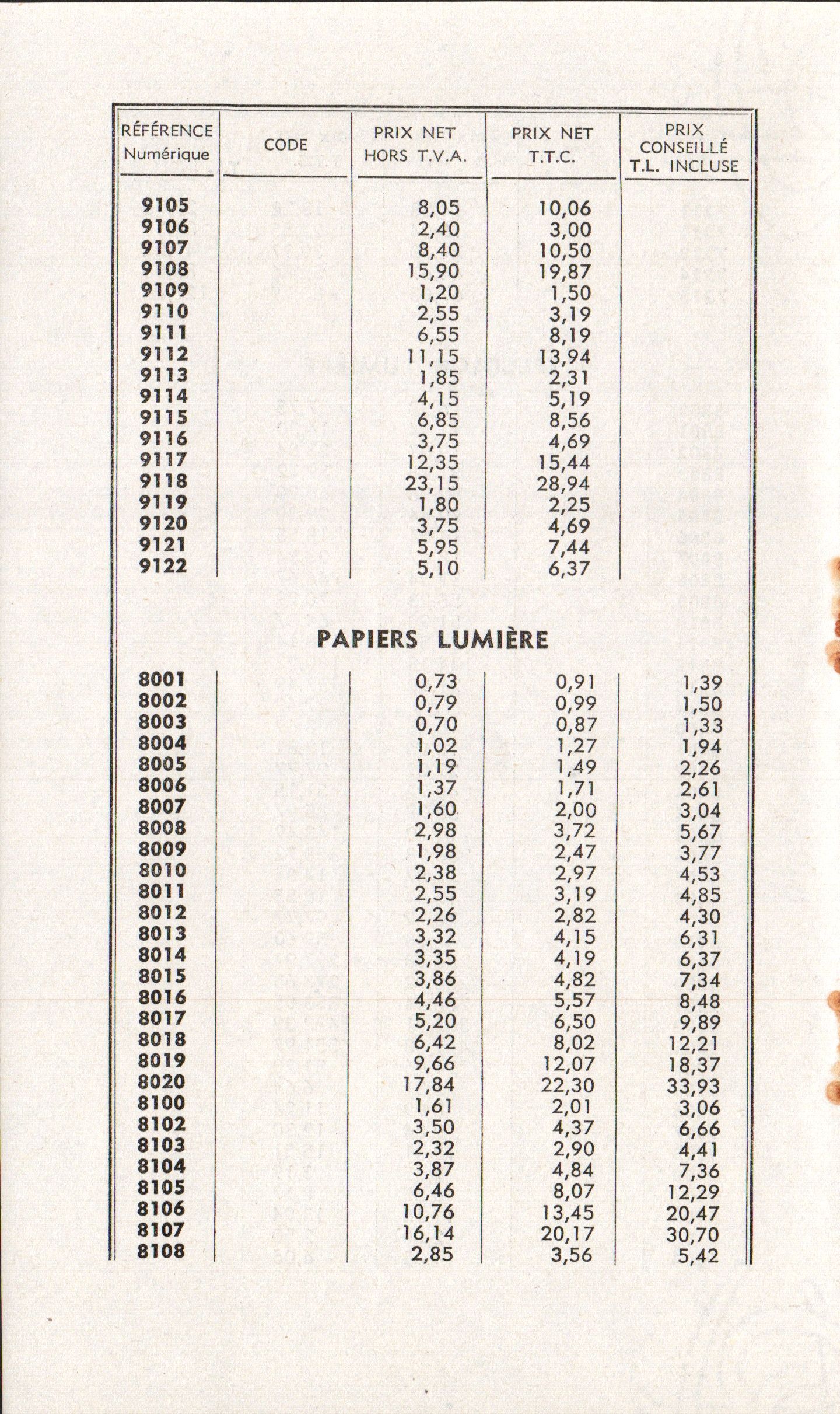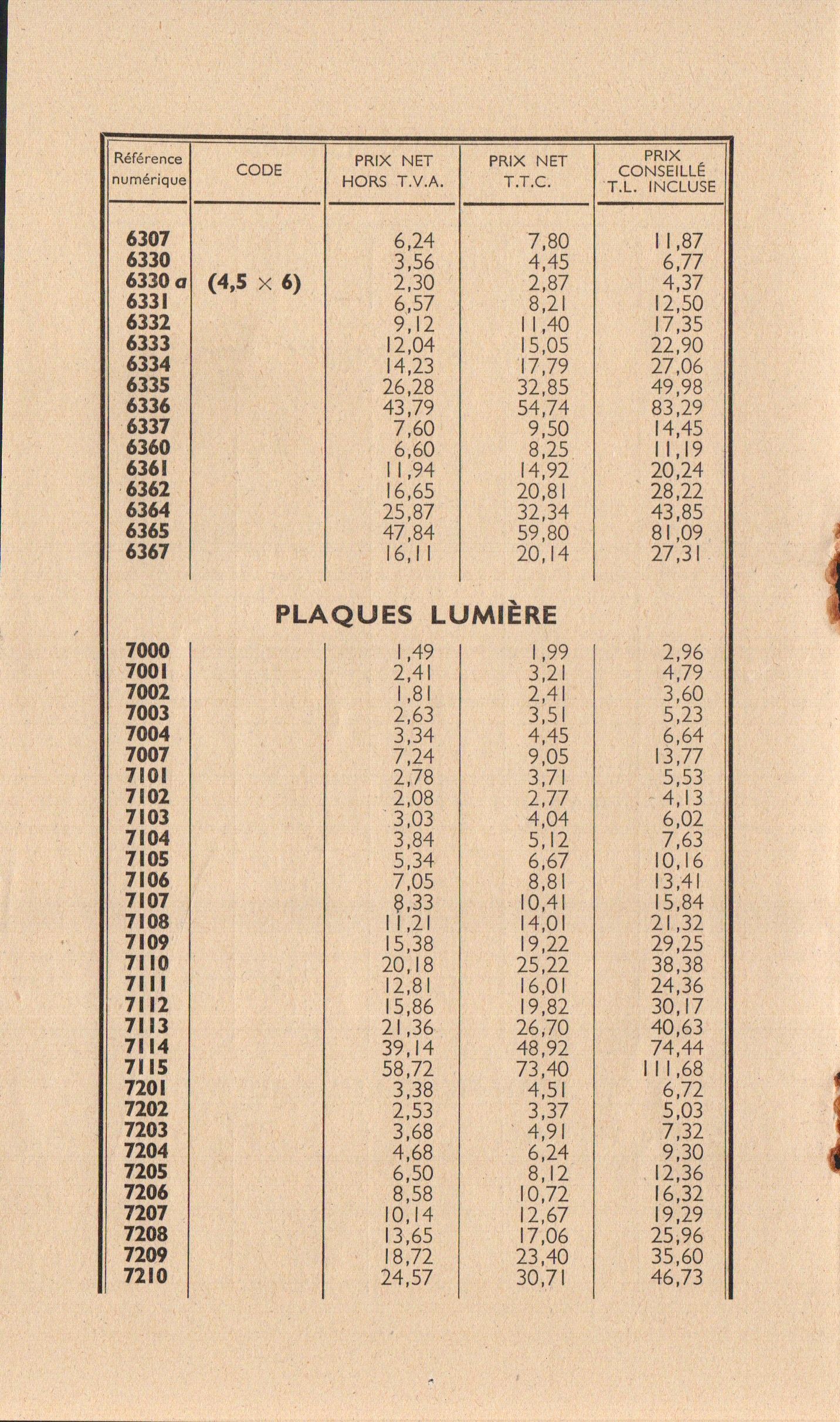 - Tarif surfaces sensibles et produits - décembre 1960