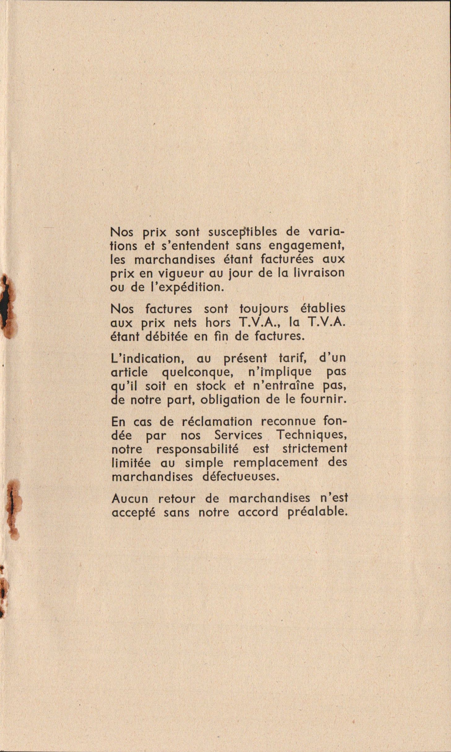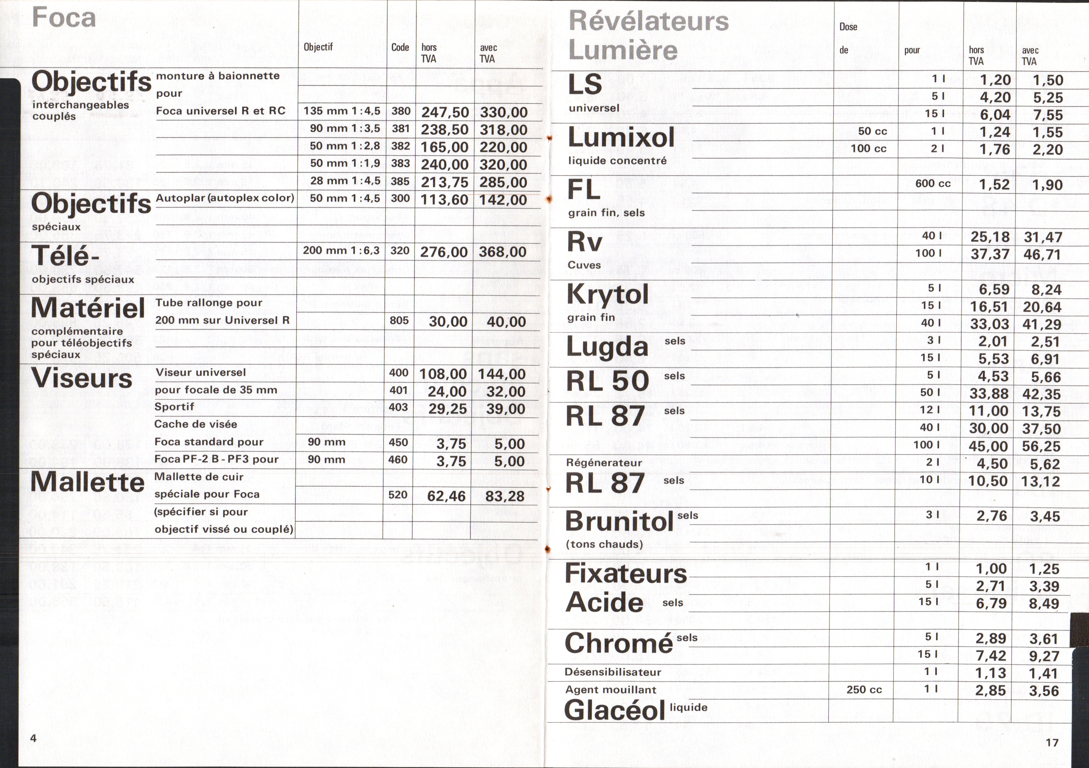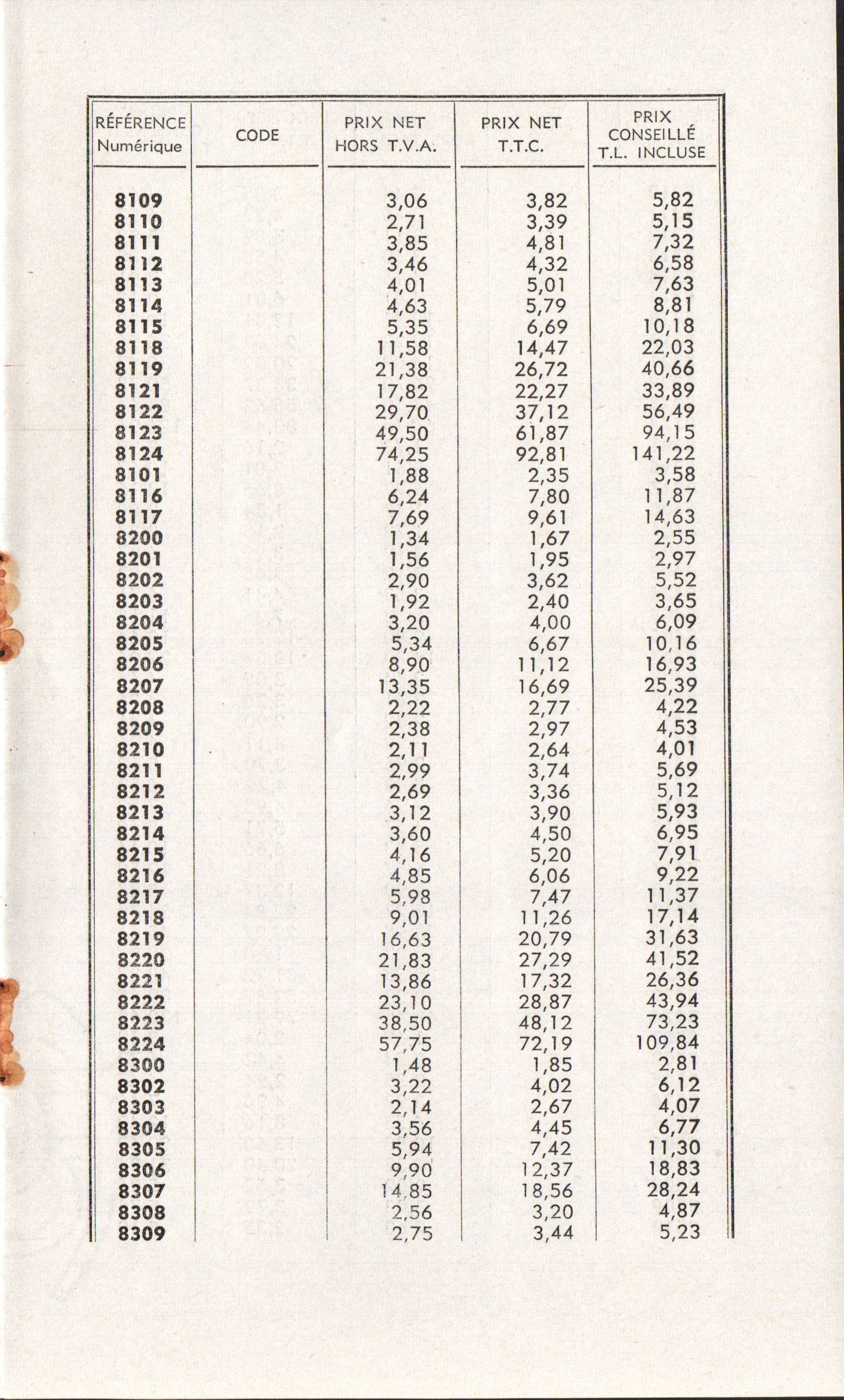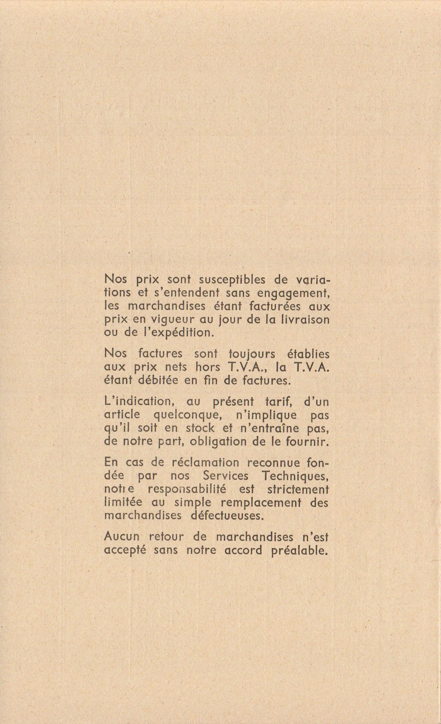 Tarif Appareils et accessoires - janvier 1963