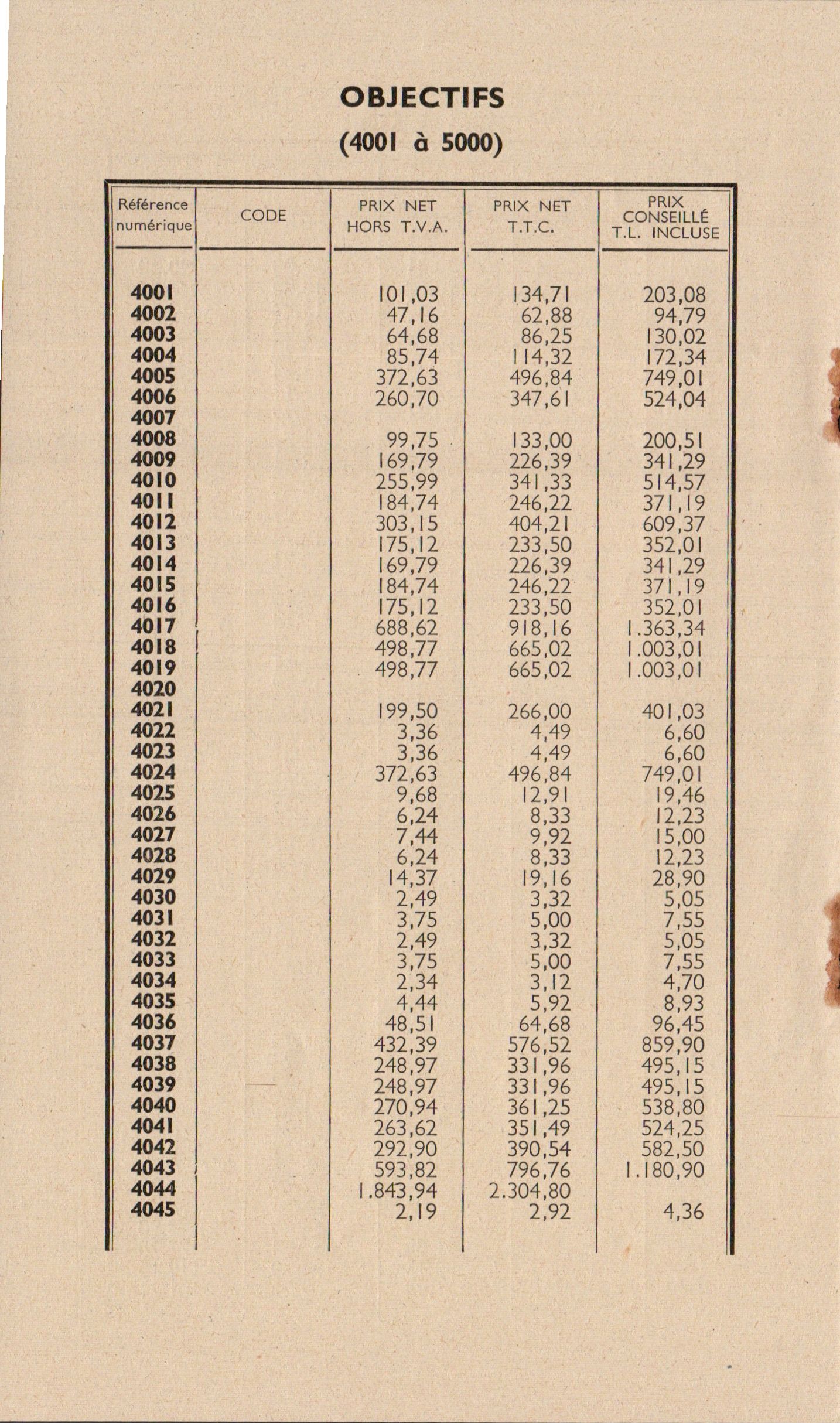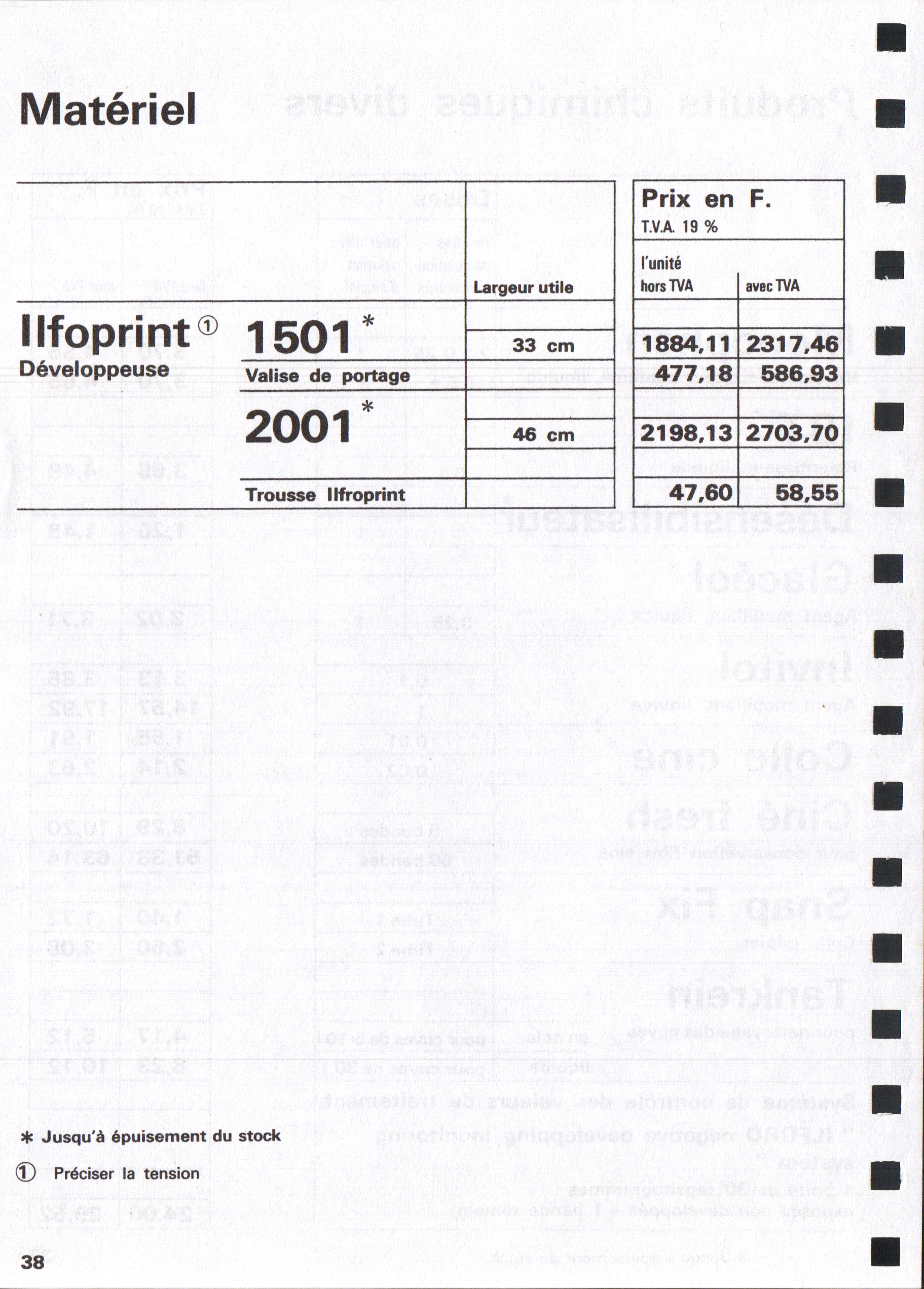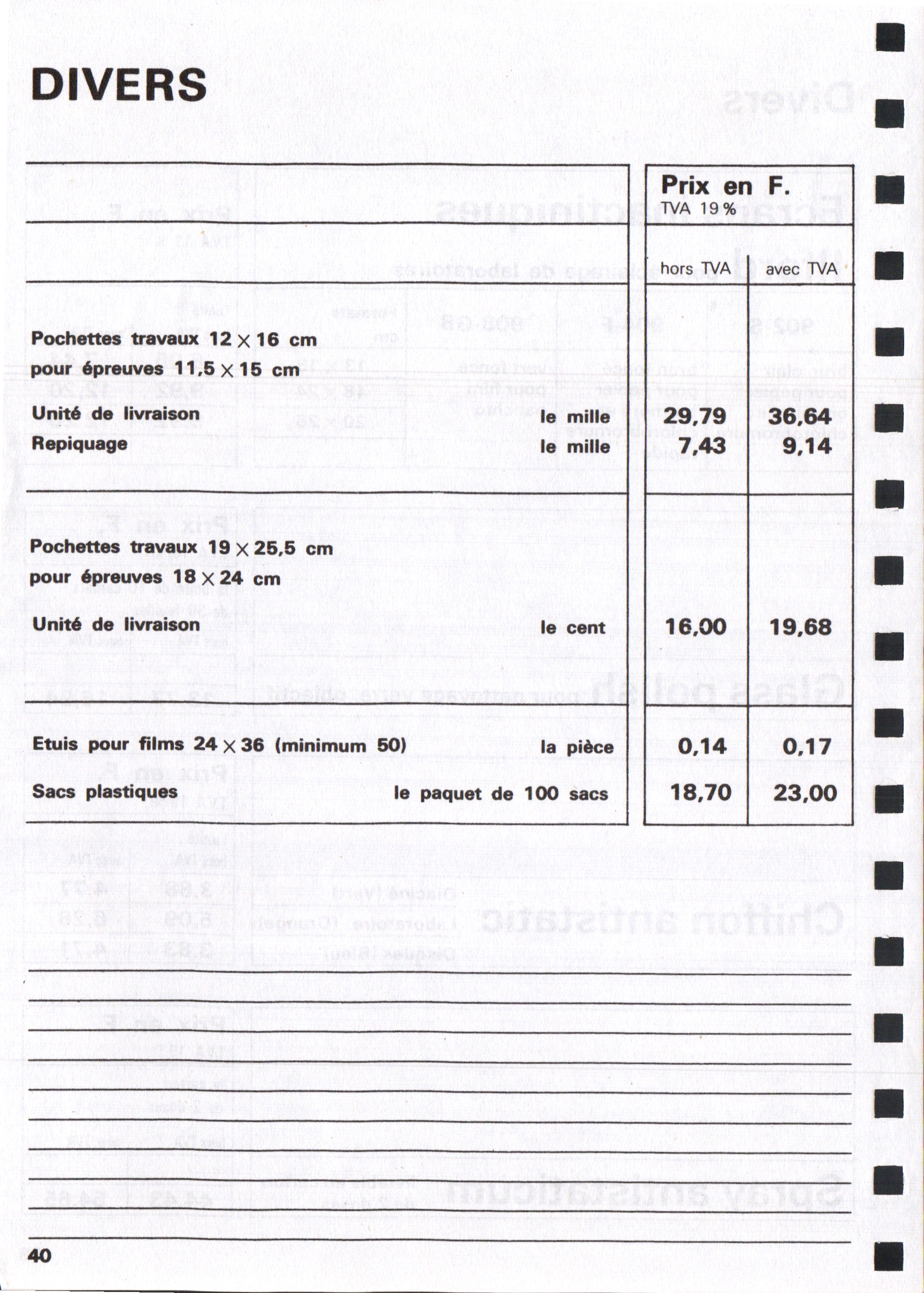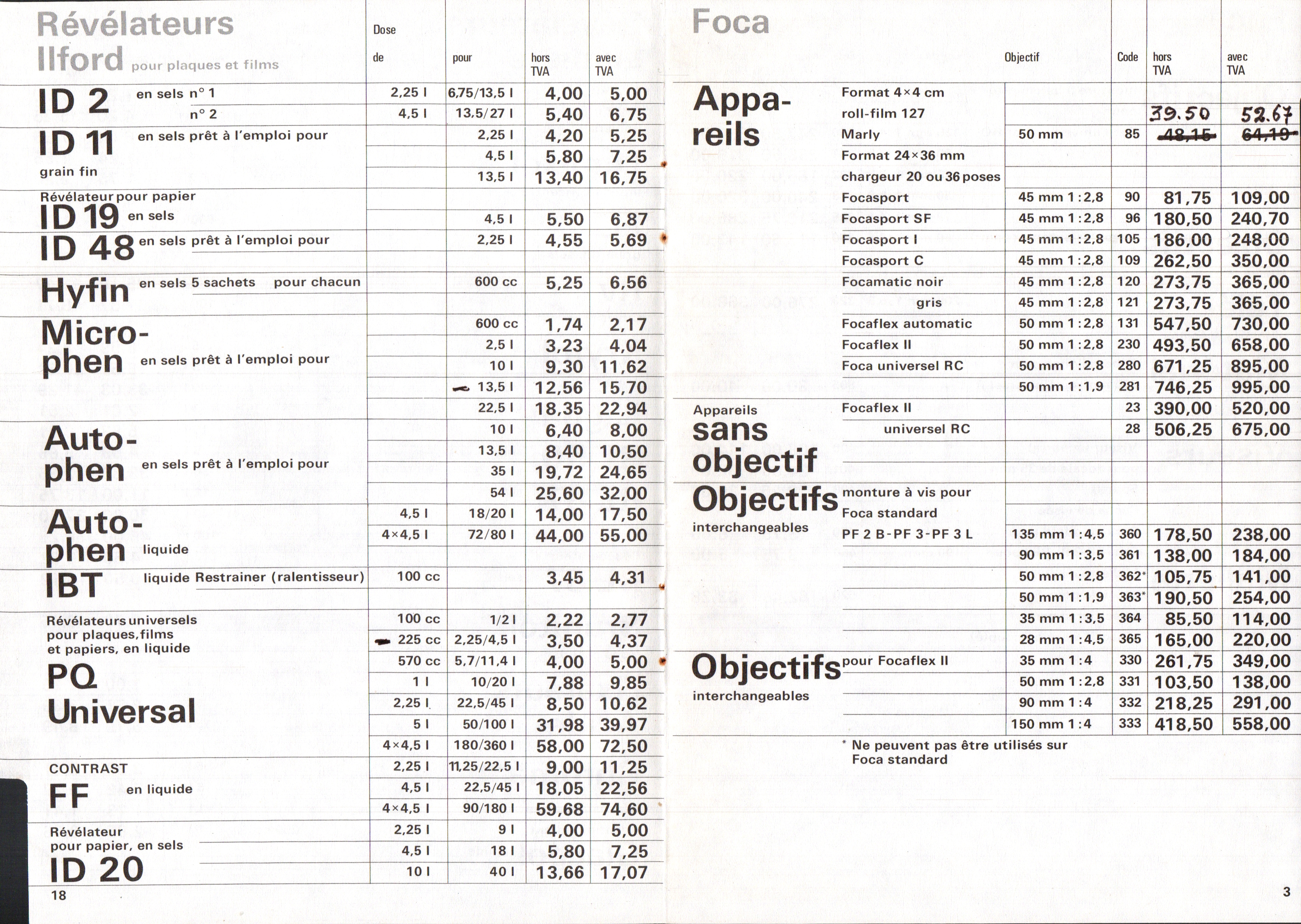 Tarif Appareils et accessoires - janvier 1963