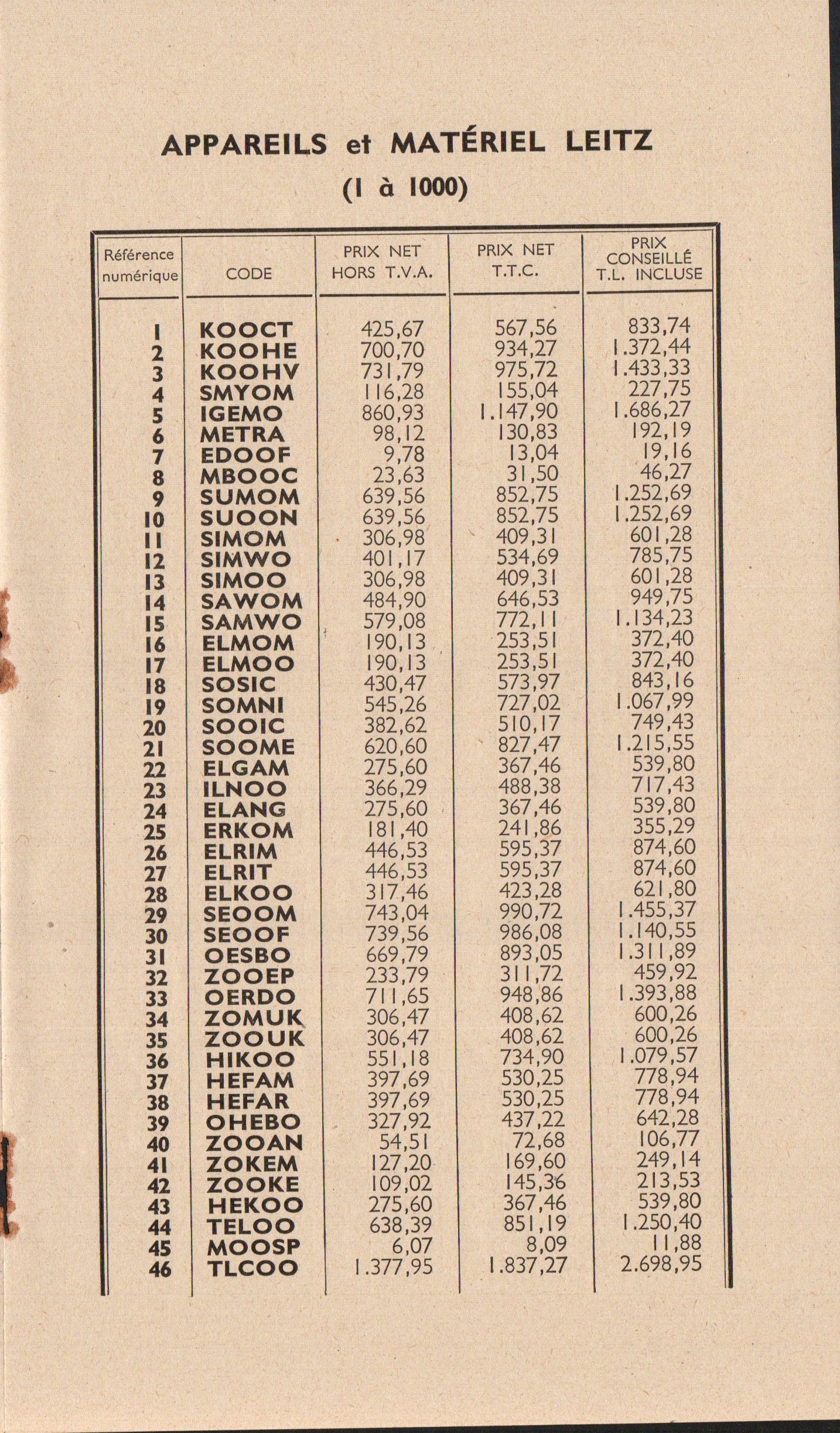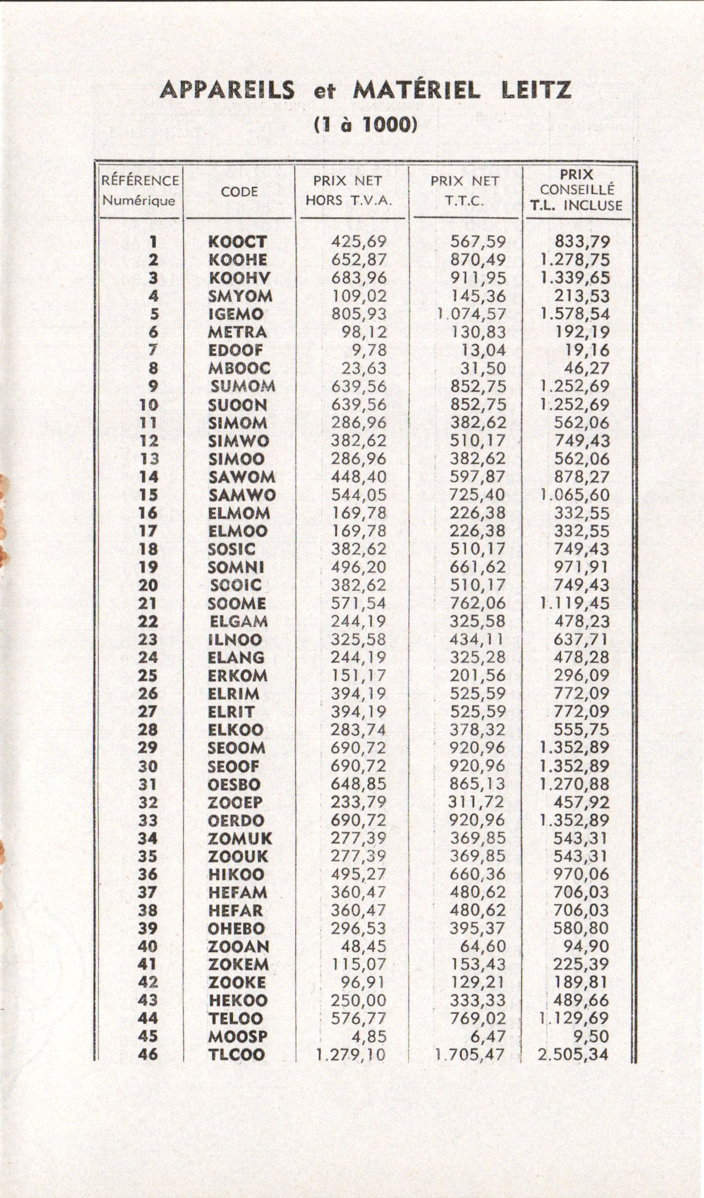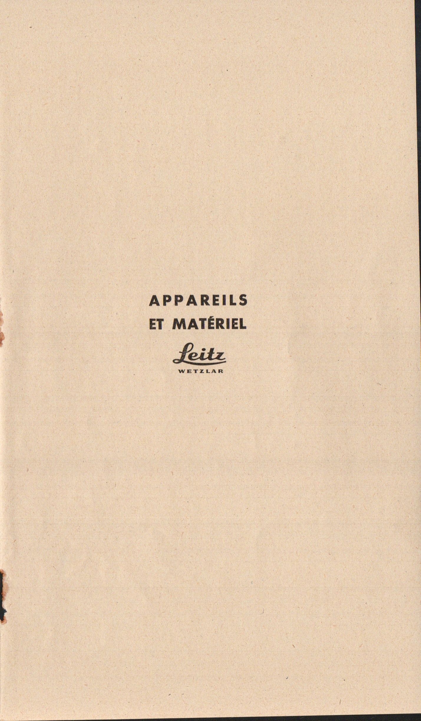 Tarif appareils et matériels Leitz Wetzlar - décembre 1960
