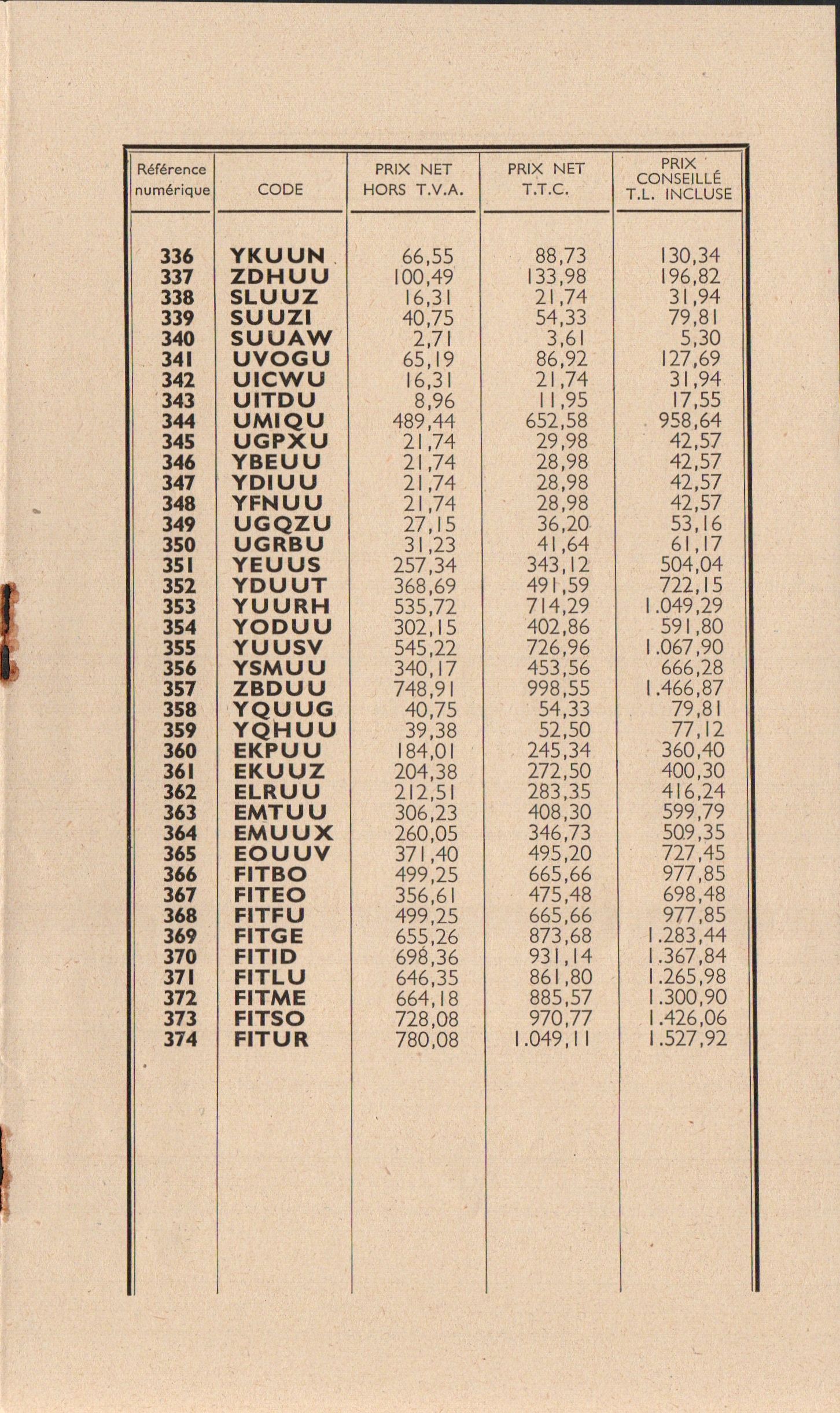 Tarif additif errata - avril 1960