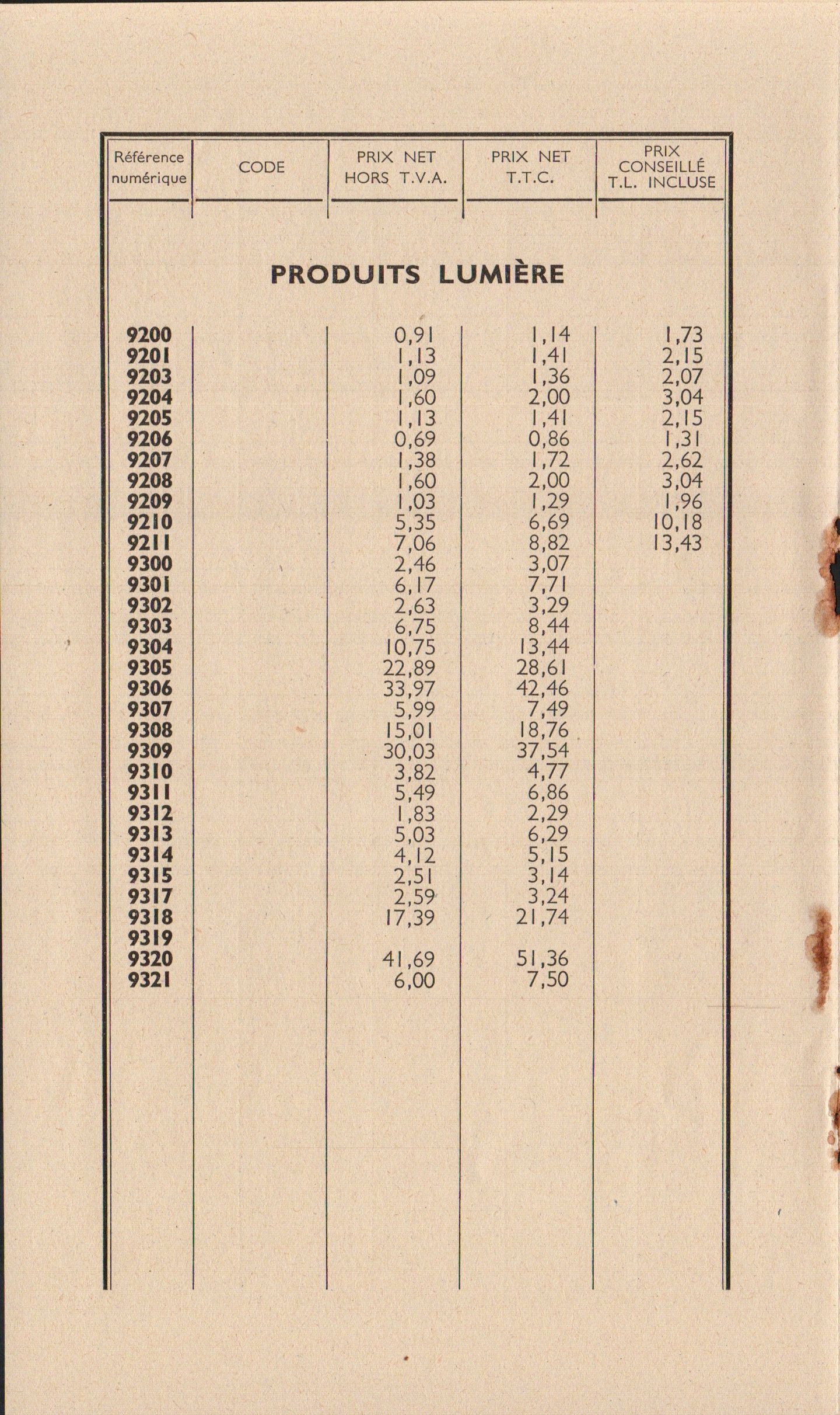 - Prix courant des produits pour lumière artificielle